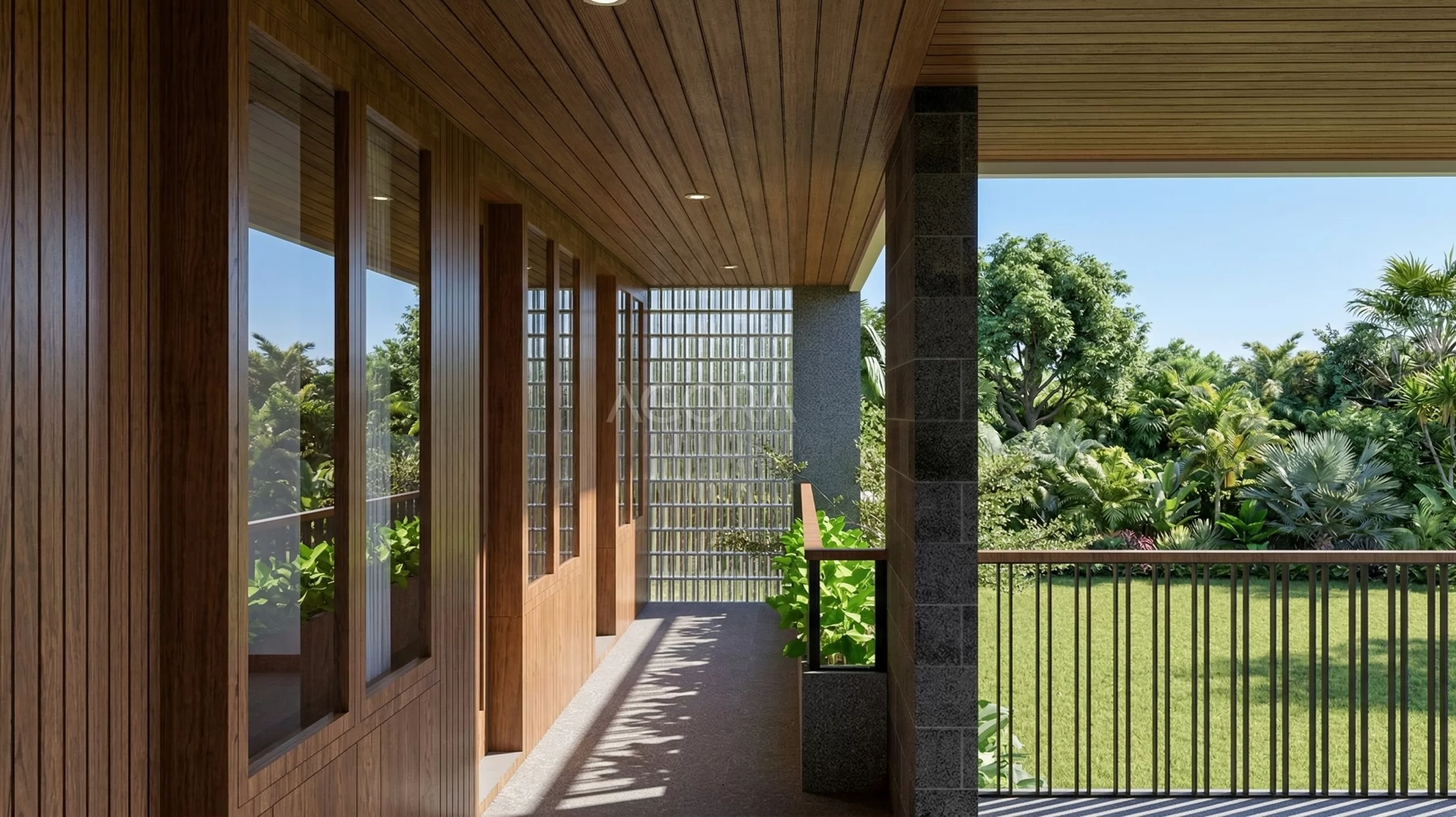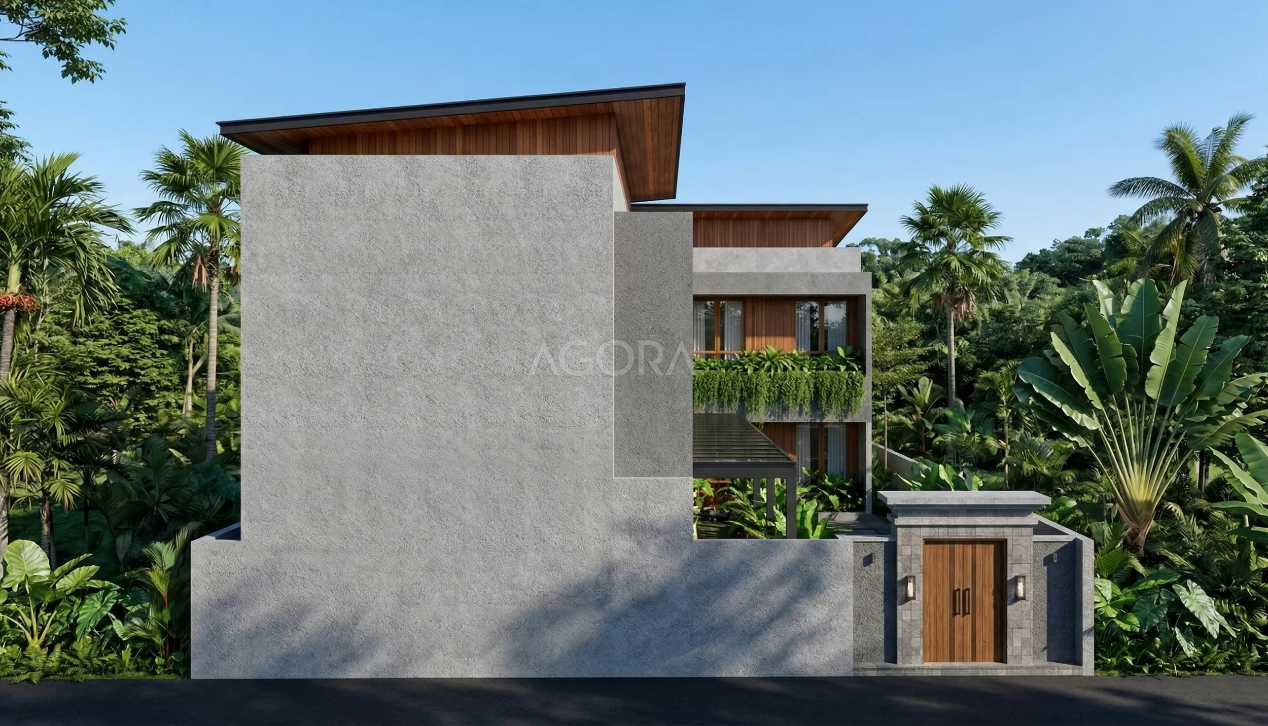 Di bagian fasad, garis-garisnya simpel dan rapi, dominan bentuk kotak tanpa ornamen berlebihan. Bukaan kaca besar dipakai buat masukin cahaya alami sekaligus bikin sirkulasi udara lebih lancar. Ada juga overhang dan kanopi yang cukup panjang, fungsinya penting banget di area tropis—buat nahan panas matahari dan tempias hujan. Jadi interior tetap adem dan nyaman.