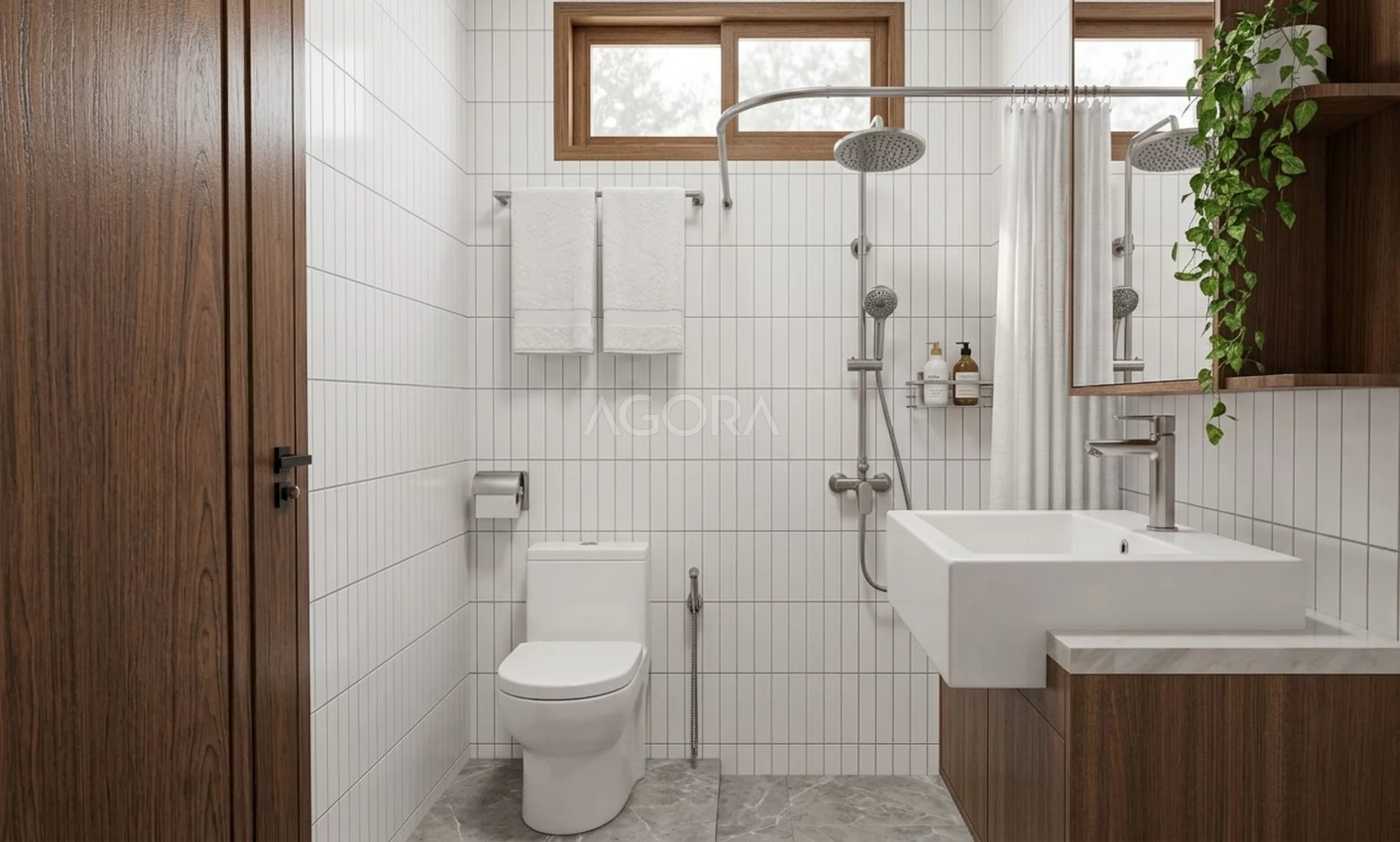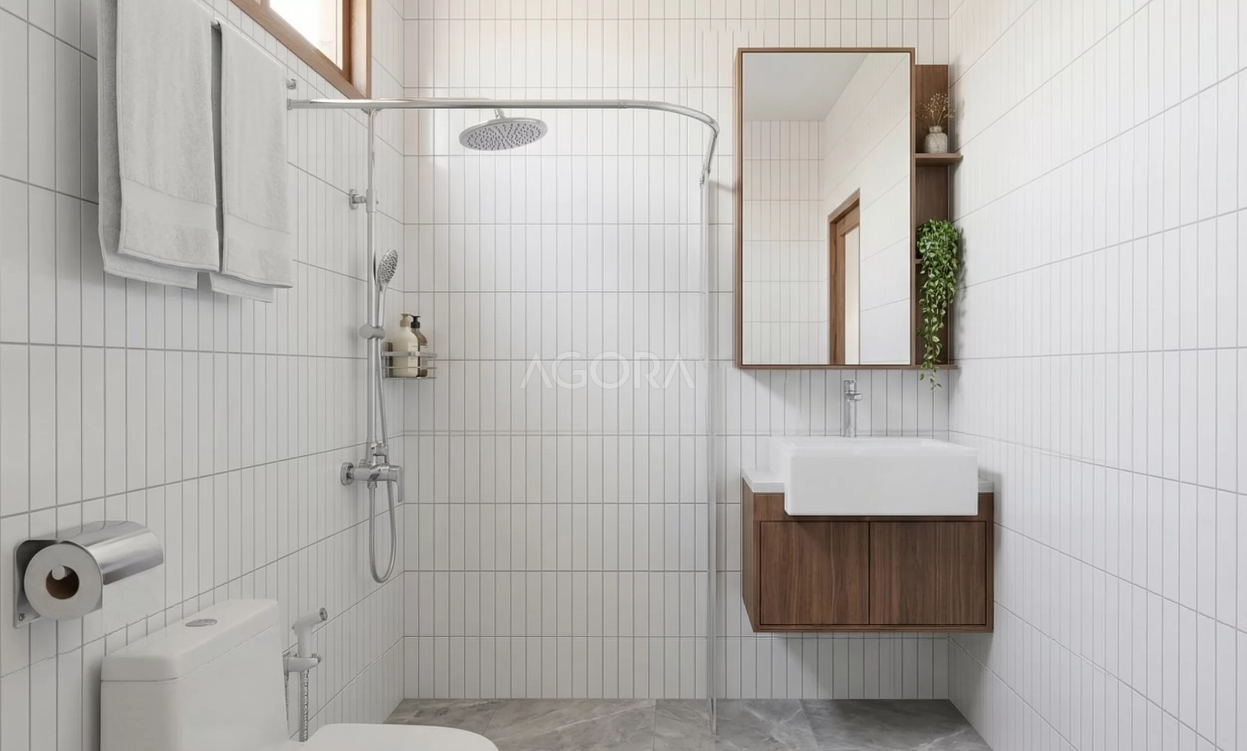 Di kamar mandi, konsepnya bersih tapi tetap hangat. Kombinasi putih dan kayu bikin suasana terasa fresh, apalagi dengan pencahayaan alami dari ventilasi. Detail seperti keramik vertikal, lantai anti-slip, sampai kabinet melayang bikin tampilannya modern tapi tetap fungsional. Bahkan cermin dengan rak terintegrasi bikin area tetap rapi tanpa ribet. Secara keseluruhan, desain ini bukan cuma soal tampilan, tapi juga soal kenyamanan dan pengalaman ruang yang terasa santai, adem, dan tetap estetik.