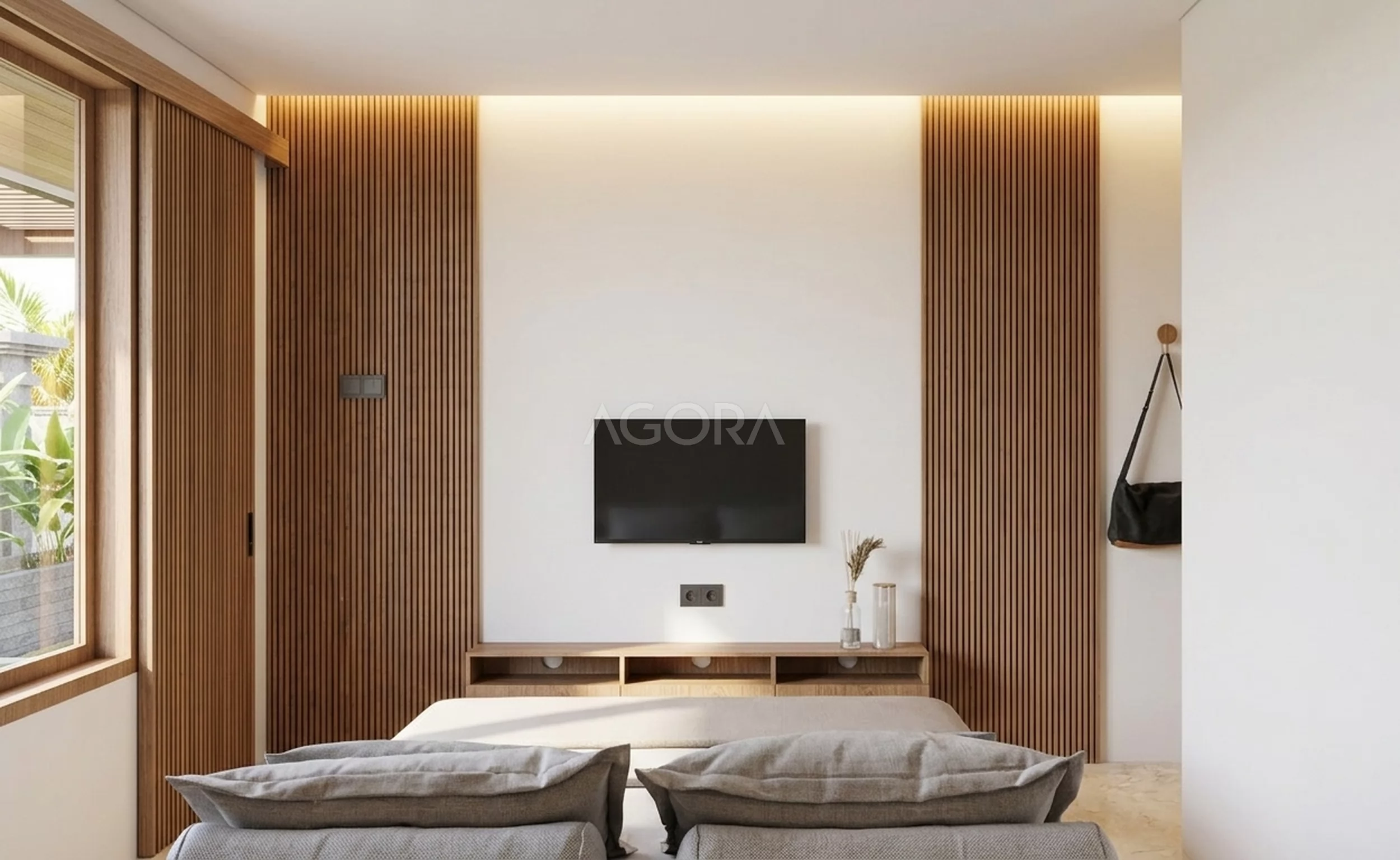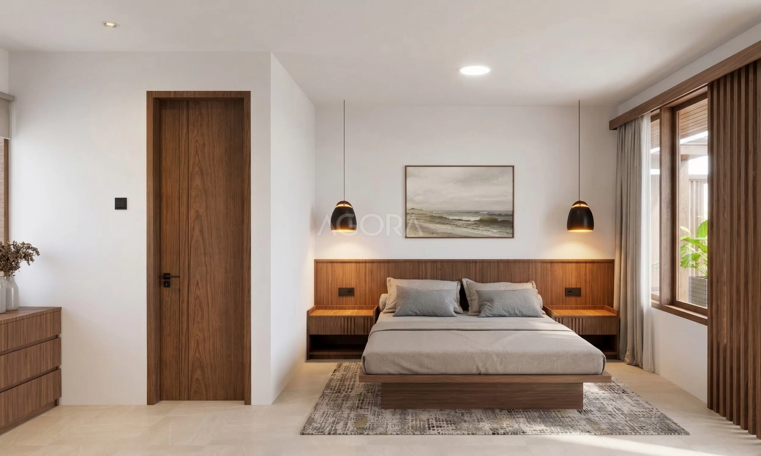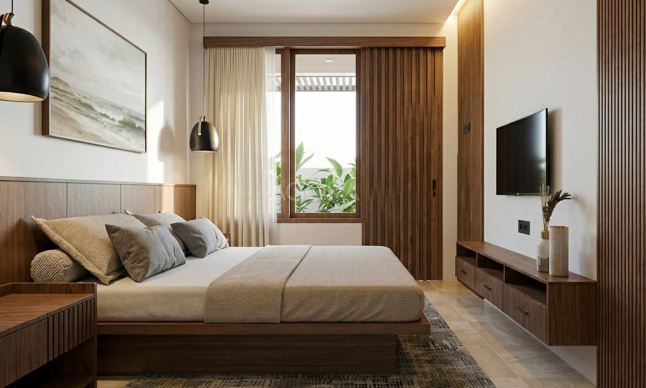 Masuk ke interior kamar tidur, nuansanya langsung terasa hangat dengan dominasi kayu dan cahaya alami. Tempat tidurnya model rendah, simpel tapi modern, bikin ruangan terasa lebih lega. Pencahayaan dibuat soft dengan LED tersembunyi di plafon, jadi suasananya lebih tenang dan nyaman. Ditambah meja TV melayang dan area storage yang rapi, semuanya terasa efisien tanpa bikin ruang jadi penuh.