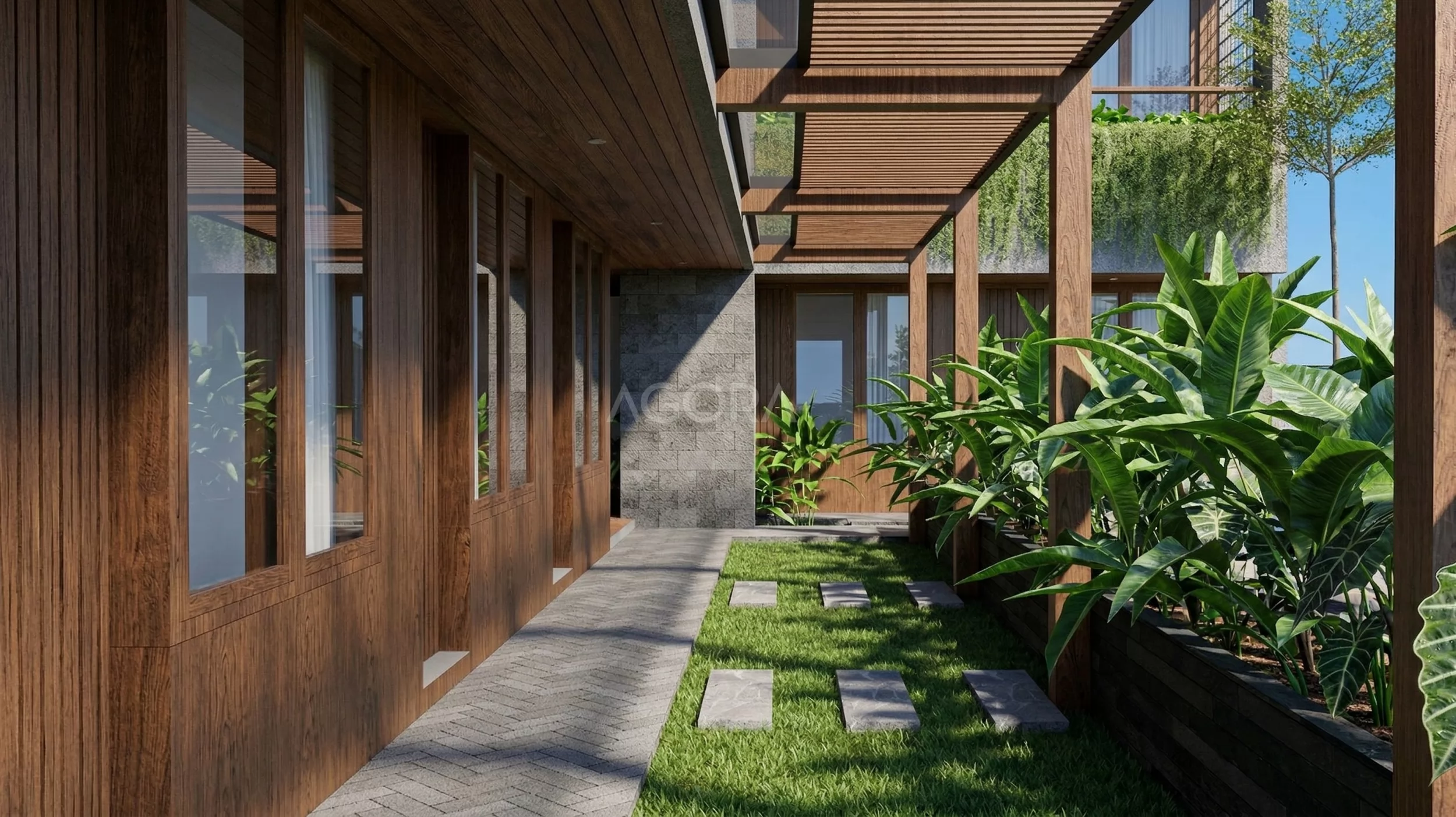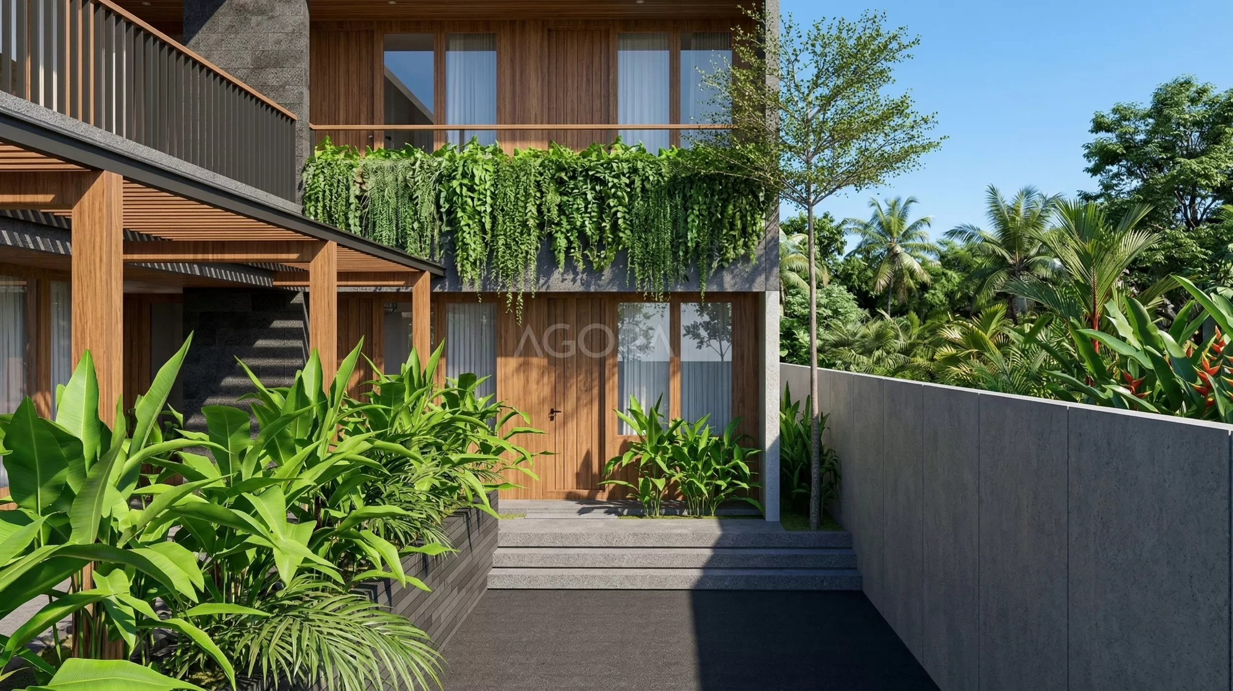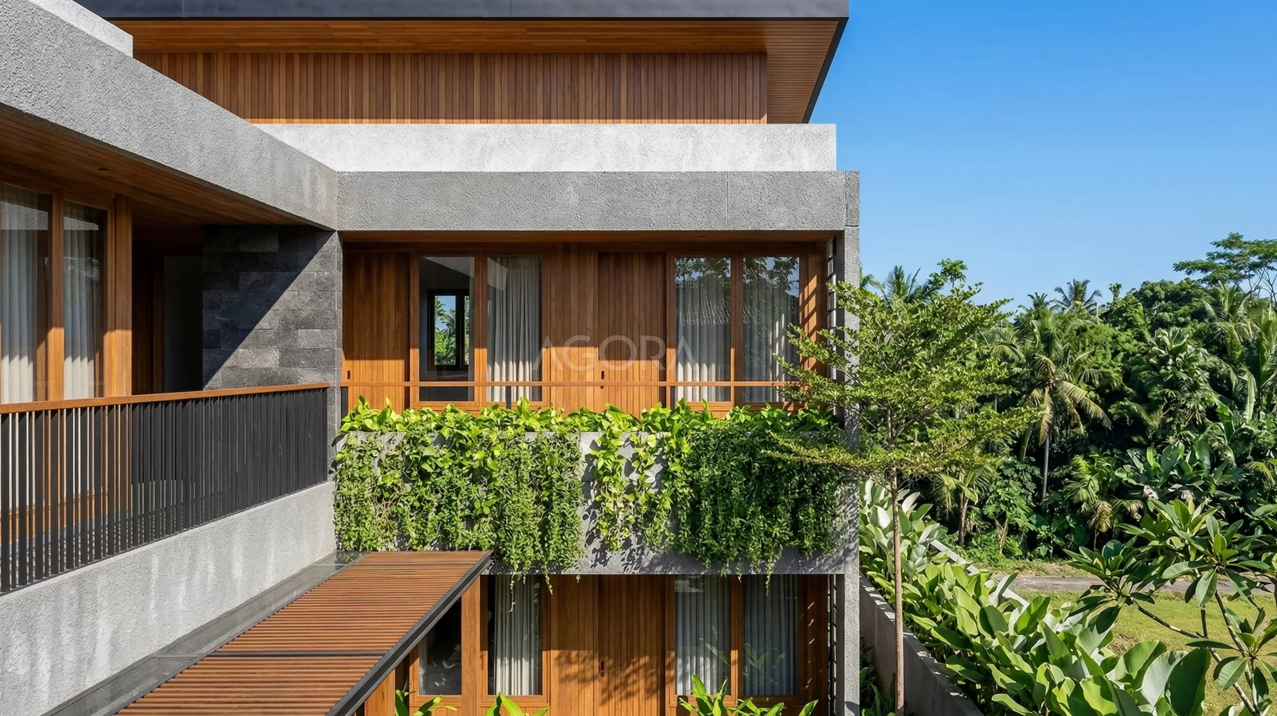 Vegetasinya juga nggak kalah penting. Tanaman pisang-pisangan, tanaman rambat, sampai pohon tinggi bikin suasana jadi lebih hidup dan adem, sekaligus melembutkan tampilan bangunan yang tegas.