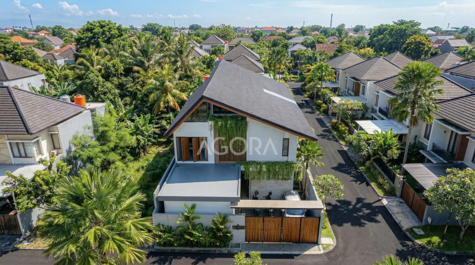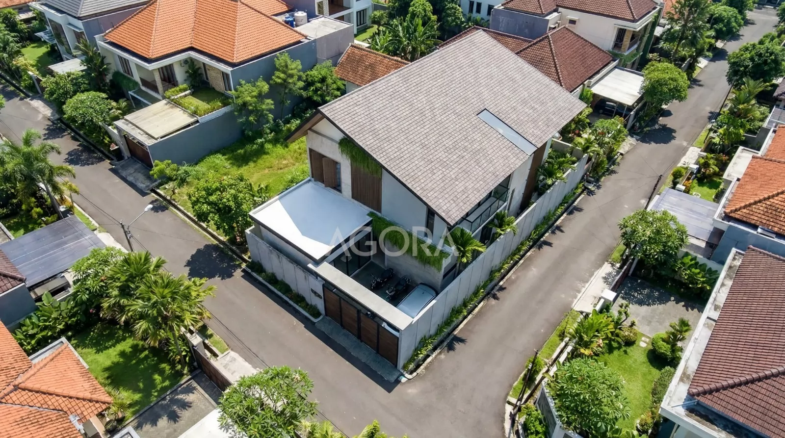 Dari luar rumah ini memiliki dua sisi fasad yang terbuka dan memungkinkan eksplorasi desain yang lebih dinamis. Mengusung konsep tropical industrial, perancangan rumah ini menitikberatkan pada perpaduan material yang jujur dan ekspresif, seperti concrete ekspos yang kokoh, elemen kayu yang hangat, serta penggunaan bukaan dan kaca berukuran lebar untuk memaksimalkan pencahayaan alami dan sirkulasi udara.