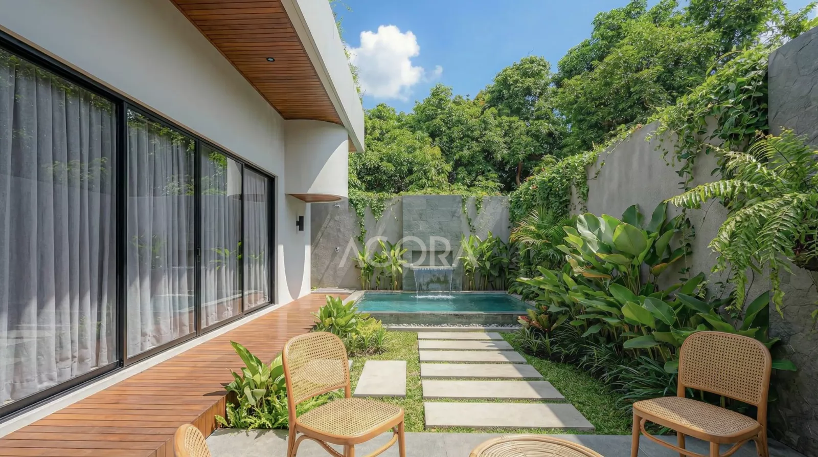 Di dalam hunian ini, terdapat area halaman yang dirancang lebih luas dibandingkan rumah pada umumnya, sebagai ruang transisi sekaligus pusat aktivitas keluarga. Area ini diisi dengan sebuah plunge pool yang memberikan kesegaran visual maupun termal, serta dikelilingi oleh vegetasi yang rimbun untuk menciptakan suasana yang asri, privat, dan menenangkan. Kehadiran elemen air dan tanaman ini tidak hanya memperkuat konsep tropis, tetapi juga menjadi elemen penting dalam menciptakan kualitas ruang yang sehat dan berkelanjutan bagi penghuni.