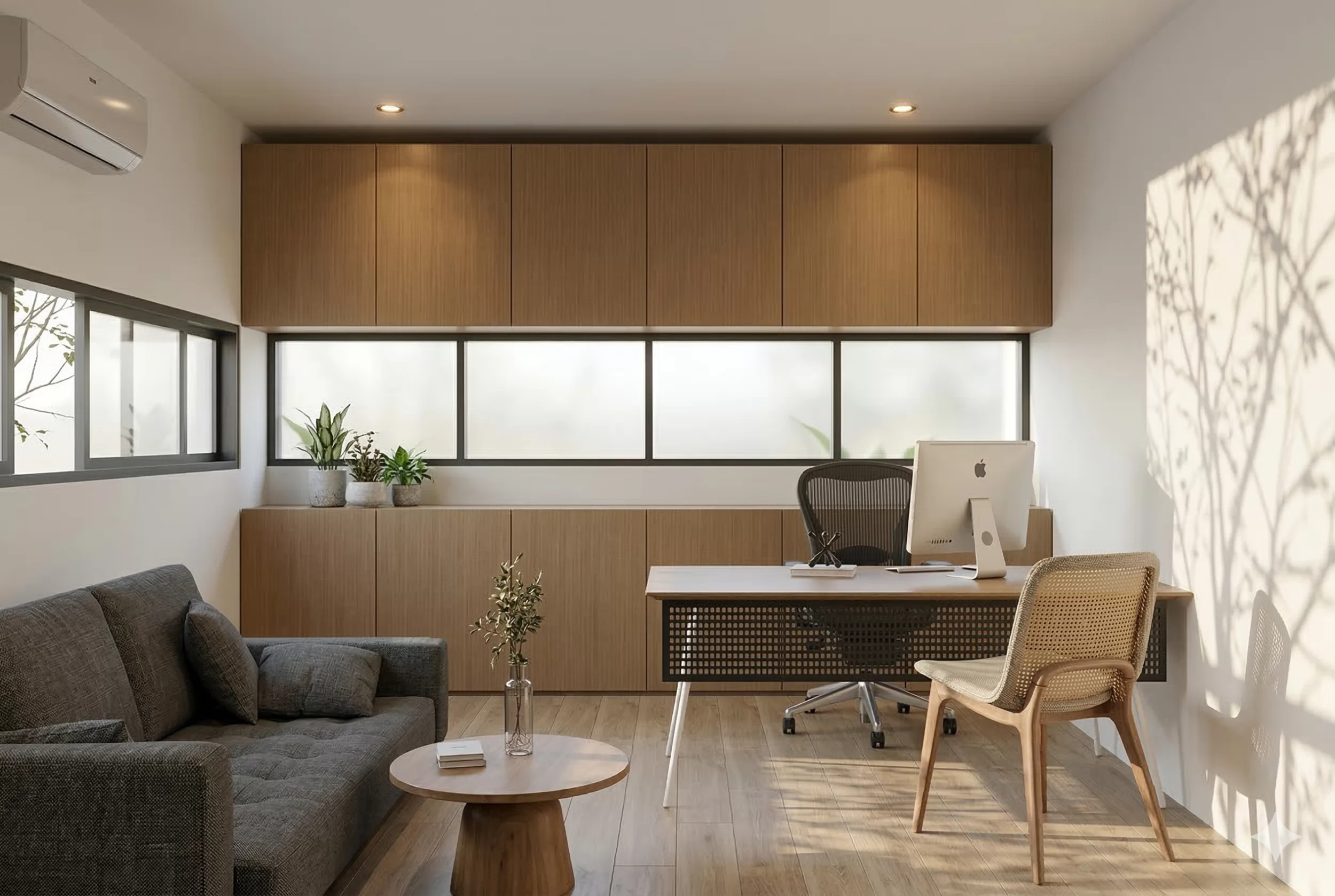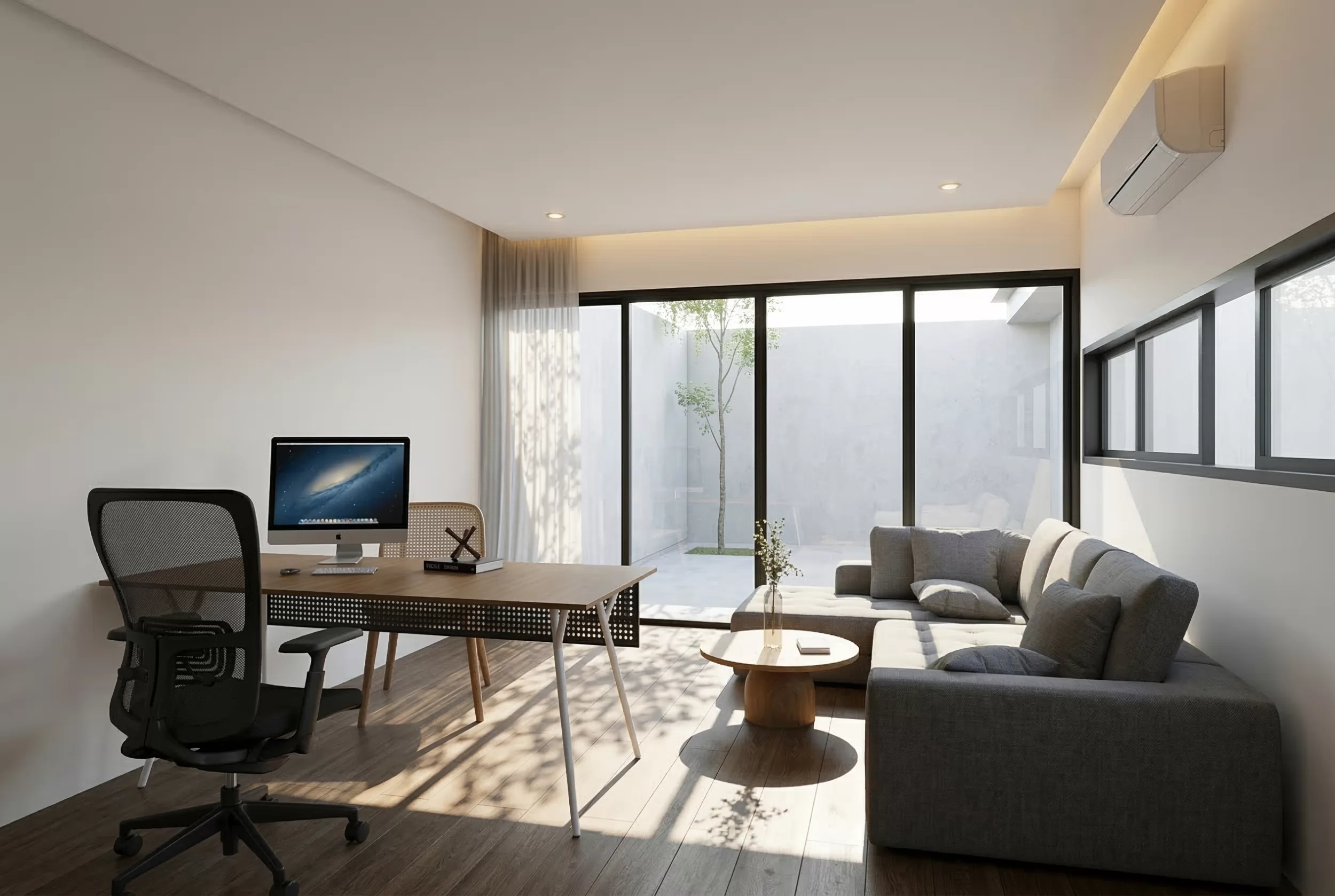 Area kerja ini dirancang minimalis dan rapi, dengan meja kayu hangat dan pencahayaan alami dari jendela yang menciptakan