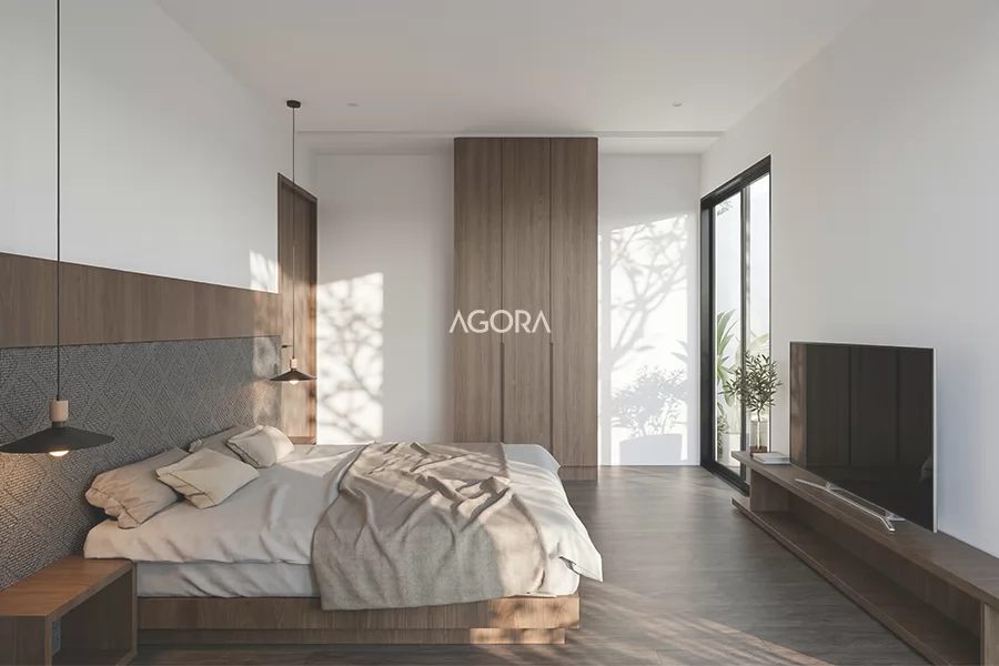 Master bedroom ini berada di lantai dua dan dirancang untuk menghadirkan suasana yang tenang serta nyaman. Bukaan kaca berukuran besar memungkinkan cahaya alami masuk dengan optimal sekaligus menyuguhkan pemandangan taman dari area planter box, sehingga tercipta atmosfer istirahat yang segar, hangat, dan menenangkan.