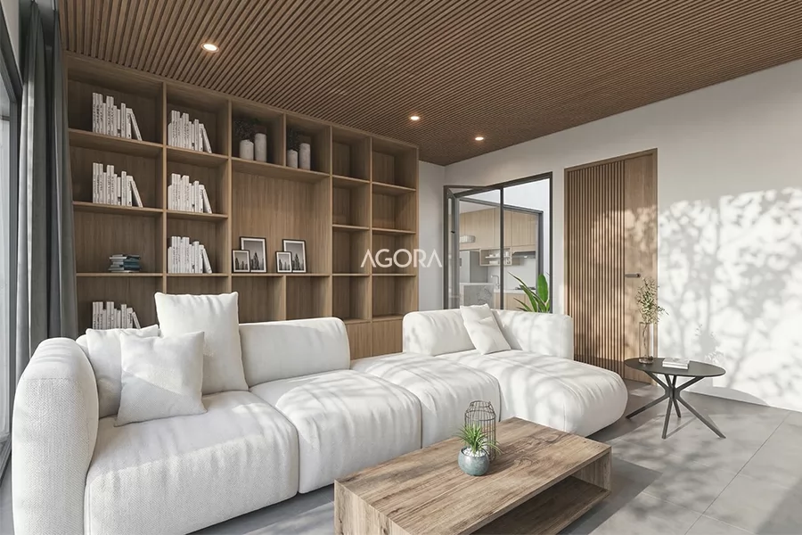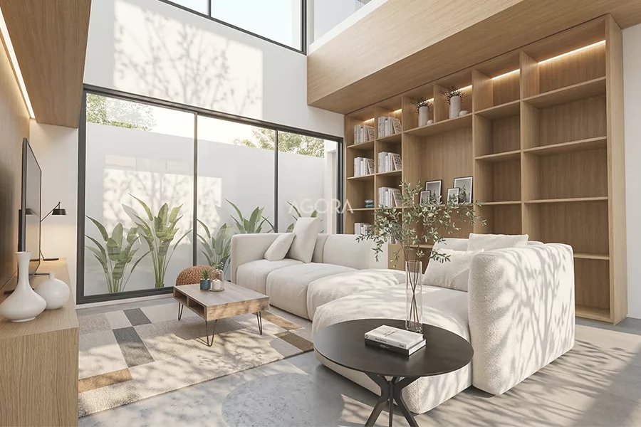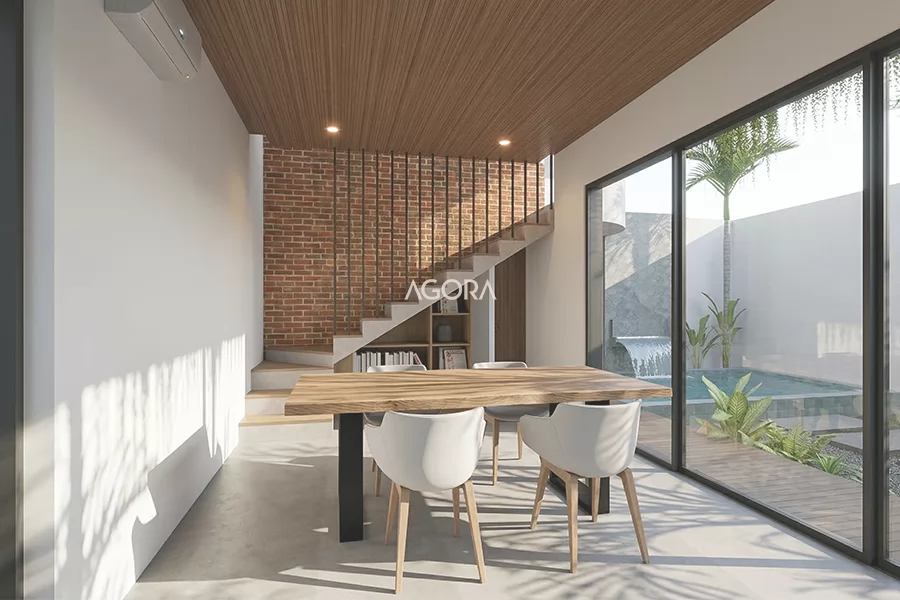 Tampil bersih dengan nuansan yang lebar dan hangat. Dipadukan dengan bukaan yang lebar dengan view kebun serta level celling yang tinggi. Tata ruang yang rapi, pencahayaan alami mampu masuk dengan maksimal serta penataan "warm light" yang tepat dapat menghasilkan suatu ruang yang nyaman baik pada siang maupun malam hari.