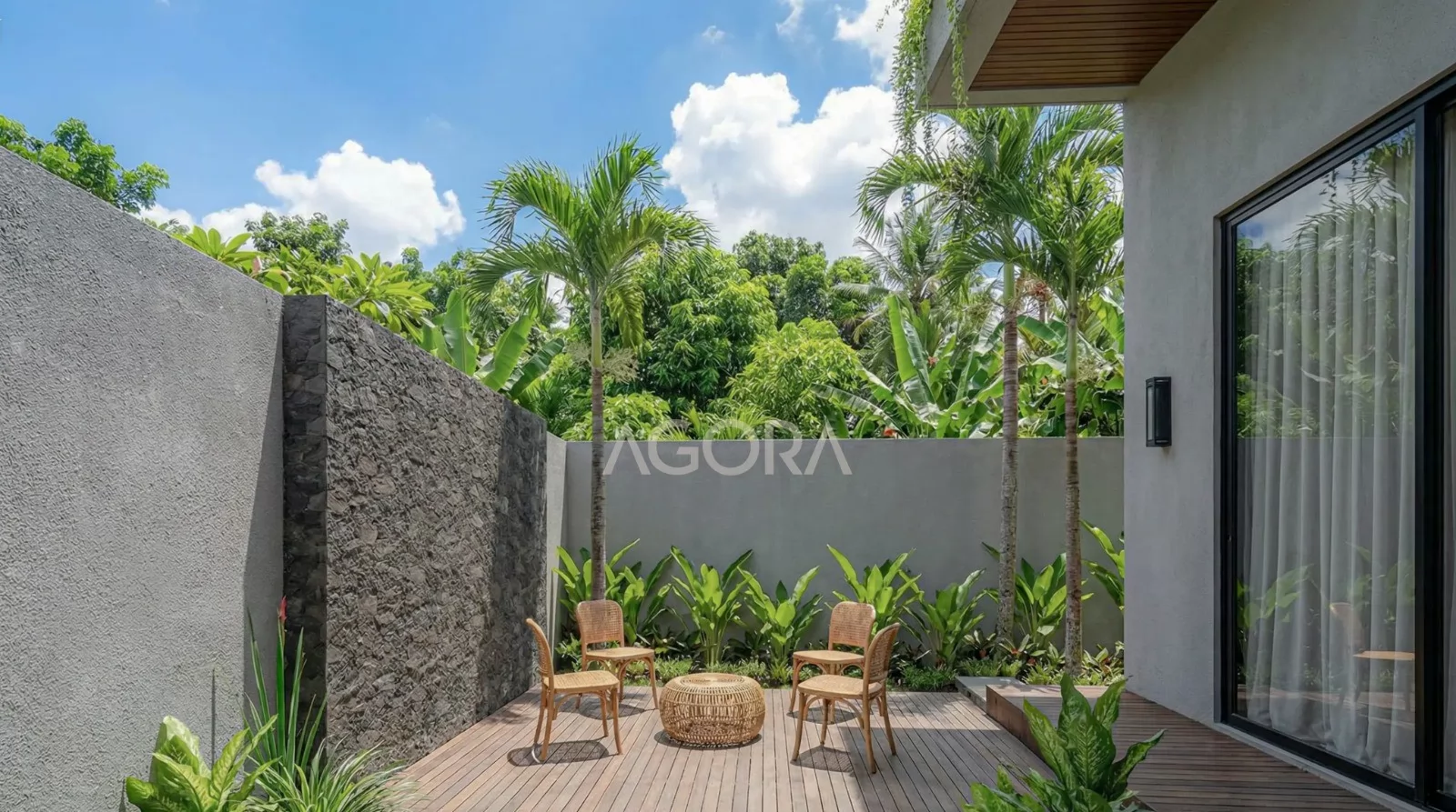 Ruang komunal outdoor sebagai ruang transisi sekaligus pusat aktivitas keluarga. Area ini diisi dengan sebuah plunge pool yang memberikan kesegaran visual maupun termal, serta dikelilingi oleh vegetasi yang rimbun untuk menciptakan suasana yang asri, privat, dan menenangkan. Kehadiran elemen air dan tanaman ini tidak hanya memperkuat konsep tropis, tetapi juga menjadi elemen penting dalam menciptakan kualitas ruang yang sehat dan berkelanjutan bagi penghuni.