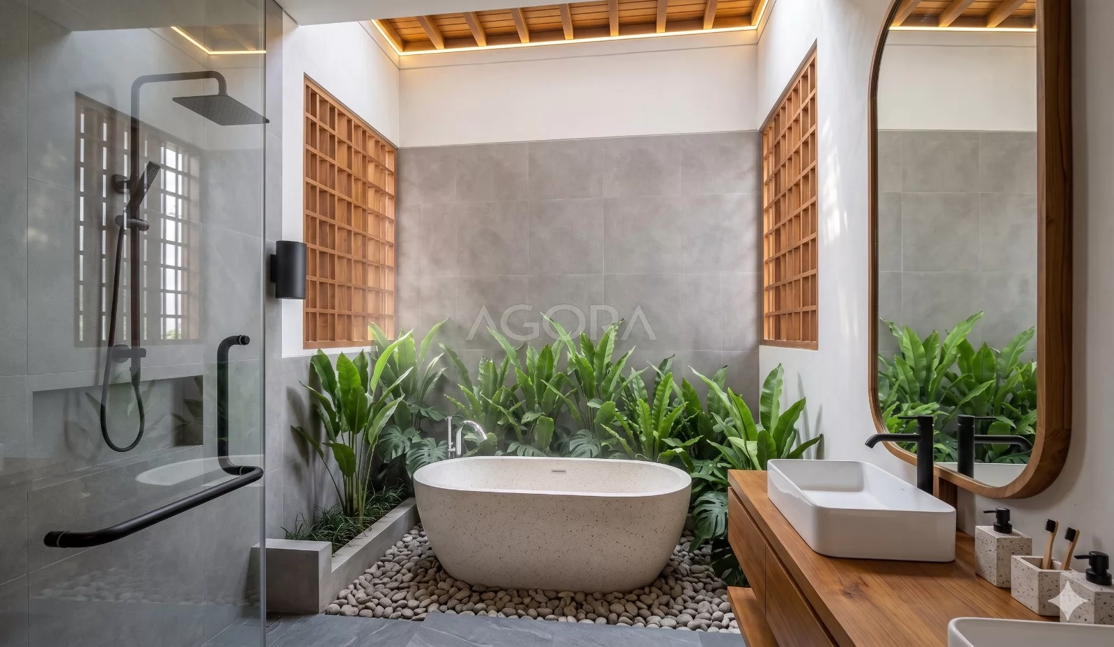 Sebagai pelengkap, bathroom dirancang dengan nuansa seperti spa di rumah sendiri. Kehadiran taman kecil di dalam kamar mandi memberikan suasana alami yang menenangkan. Bathtub yang menghadap ke taman menjadi focal point utama, dipadukan dengan material bernuansa natural dan pencahayaan alami dari atas, membuat ruang terasa terang, segar, dan tetap privat.