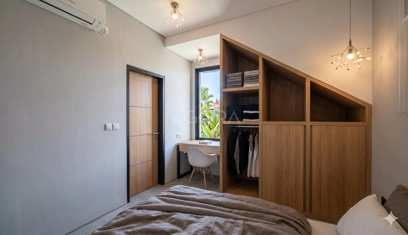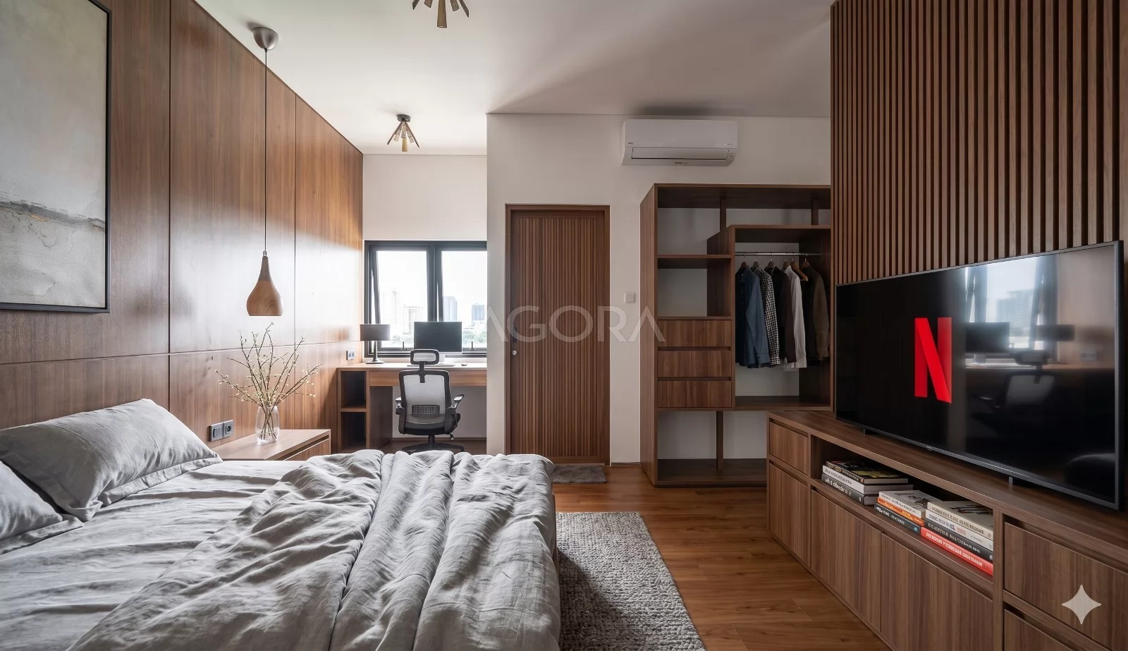 Masuk ke area privat, bedroom utama dirancang dengan nuansa hangat dan elegan melalui dominasi material kayu pada dinding dan furniturenya. Di dalam kamar juga tersedia area kerja yang tertata rapi, cocok untuk aktivitas sehari-hari. Bukaan jendela yang cukup besar membantu cahaya alami masuk dengan maksimal, sementara walk-in wardrobe memberikan ruang penyimpanan yang praktis dan tetap terlihat rapi.