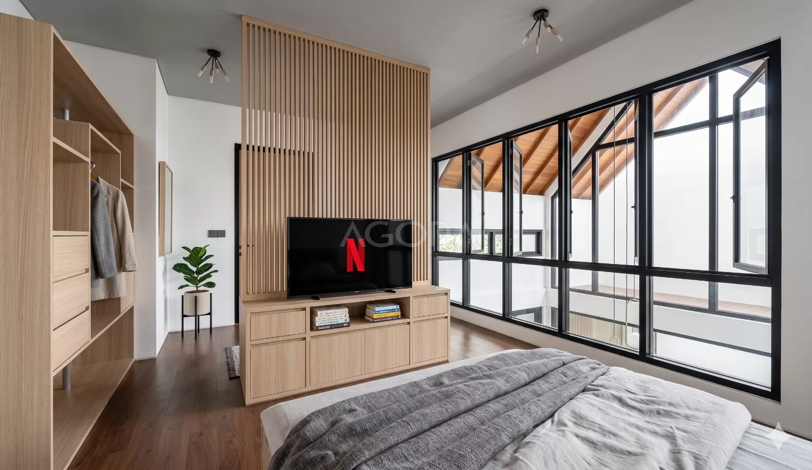 Bedroom kedua hadir dengan konsep yang lebih terbuka, menggunakan jendela lebar yang membuat ruang terasa lebih luas dan terang. Aksen partisi kayu vertikal menjadi detail menarik sekaligus pembatas visual yang halus, menciptakan suasana kamar yang nyaman untuk beristirahat.