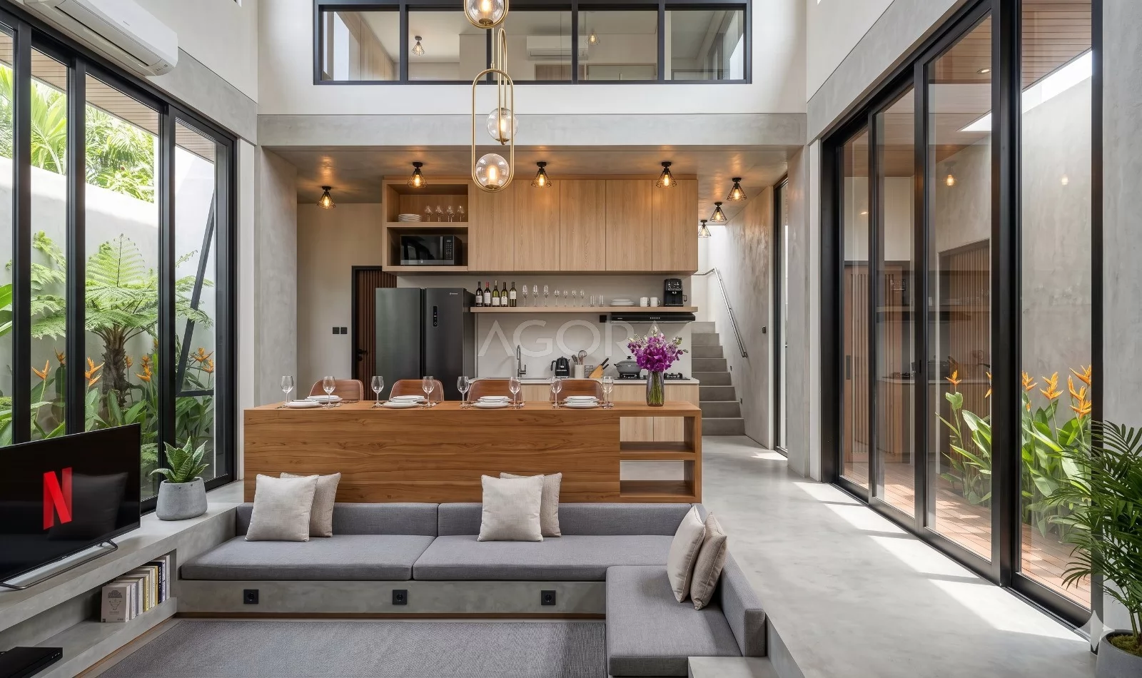 Hunian ini dirancang dengan gaya modern tropis, yang menggabungkan tampilan modern yang bersih dengan kenyamanan iklim tropis yang hangat dan alami. Desainnya memaksimalkan cahaya alami, sirkulasi udara, serta penggunaan material natural seperti kayu dan batu alam, sehingga rumah terasa nyaman sekaligus punya karakter yang kuat.