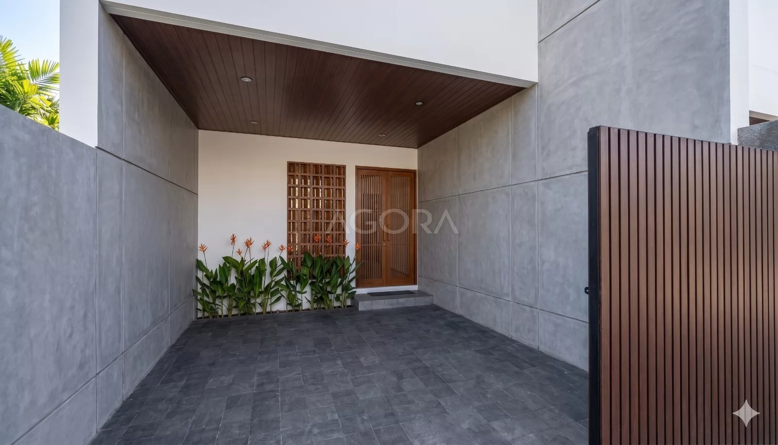 Masuk ke area carport, ruangnya dirancang minimalis tapi tetap lega untuk parkir kendaraan. Dinding di sisi kanan dan kiri memberi rasa aman dan privasi, sementara plafon dengan finishing kayu dan sentuhan tanaman di dekat pintu masuk menciptakan kesan pertama yang hangat dan menyambut saat tiba di rumah.