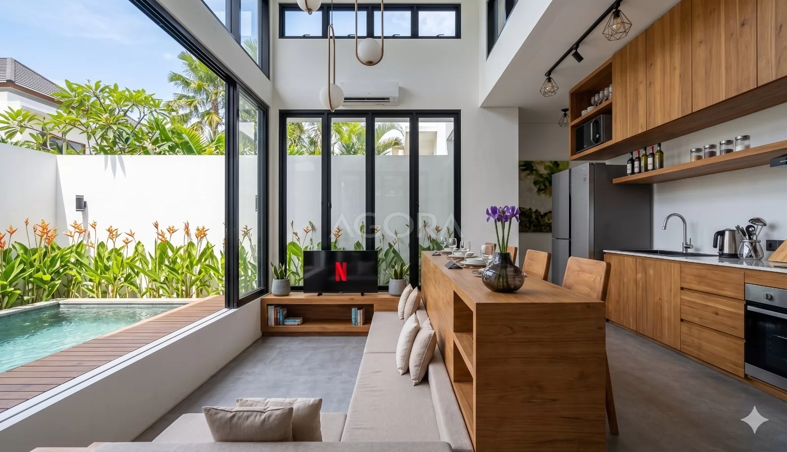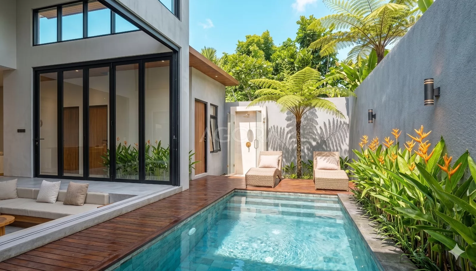 Beralih ke area outdoor, kolam renang jadi salah satu elemen utama yang langsung memberi nuansa tropis yang segar. Tanaman hijau di sepanjang sisi kolam membuat suasana terasa lebih privat dan alami, sementara deck kayu di samping kolam jadi spot yang nyaman untuk duduk santai, baik di pagi maupun sore hari.