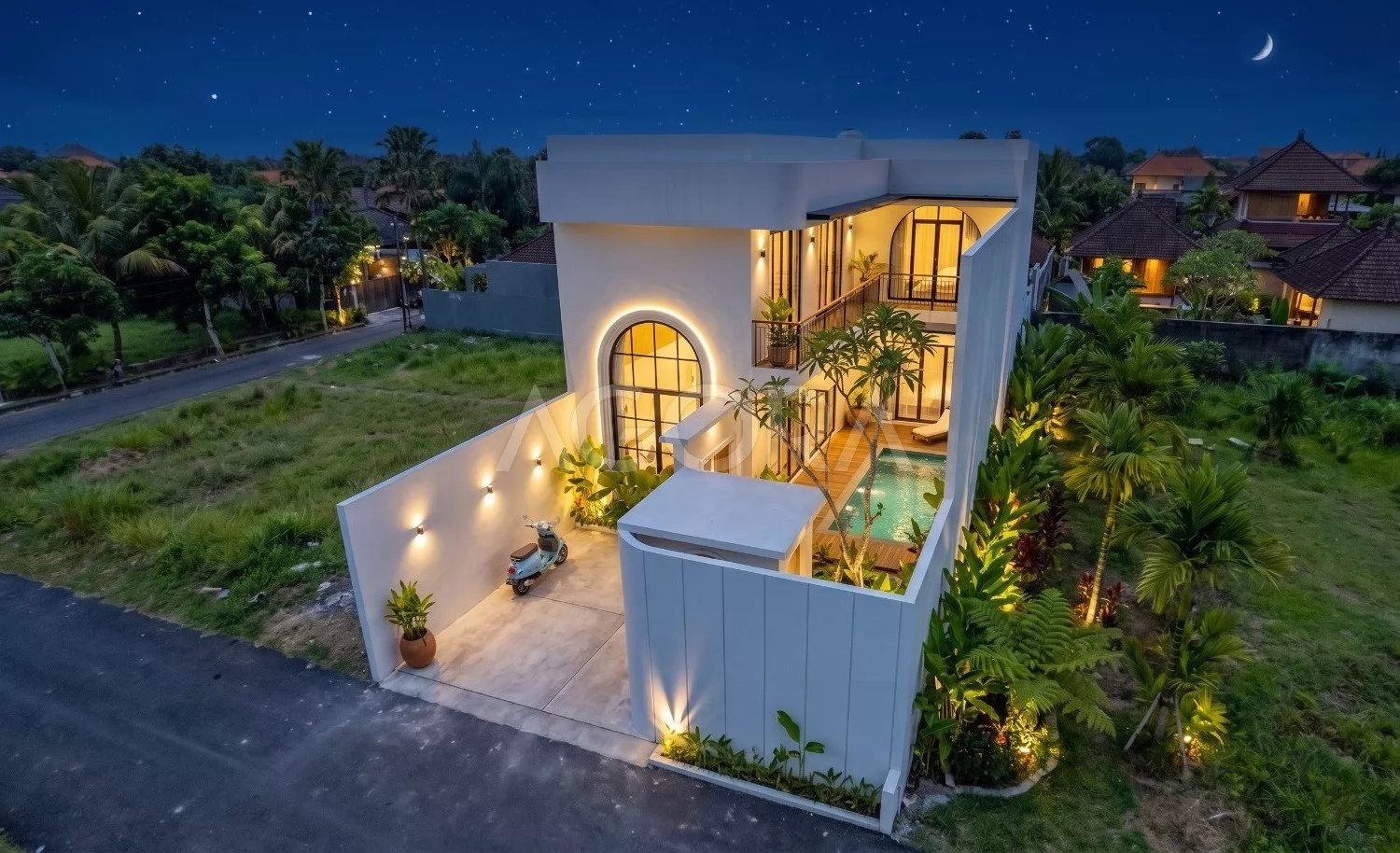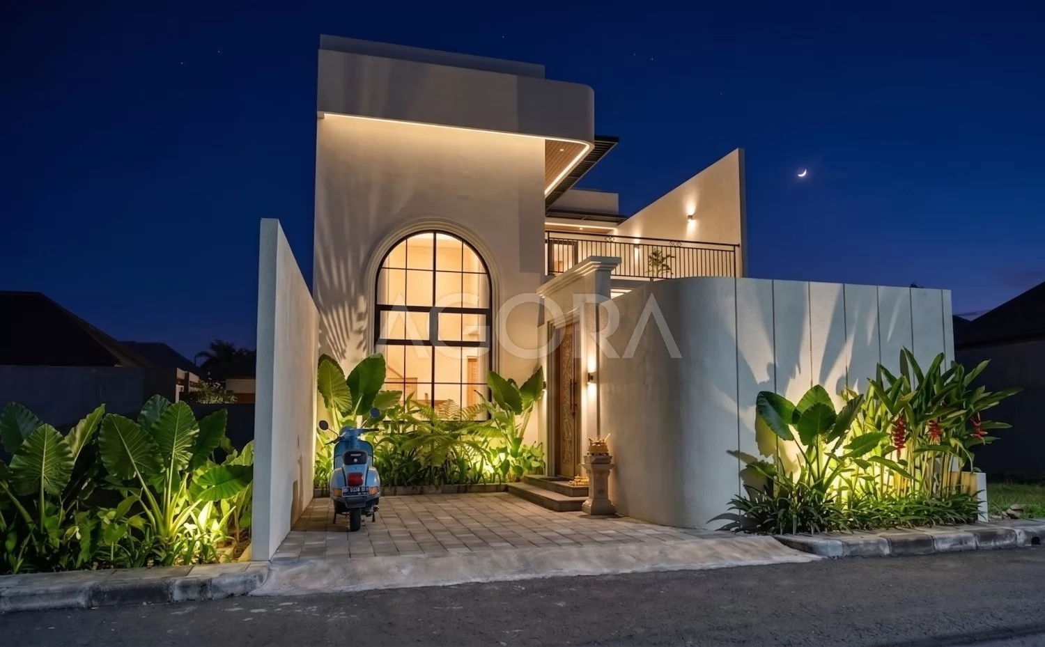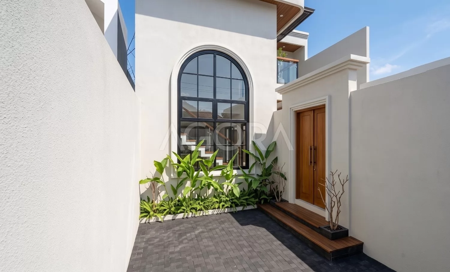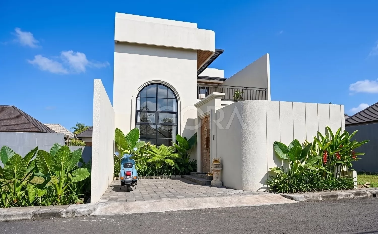 Desain villa modern tropis ini menghadirkan pengalaman tinggal layaknya private resort, dengan komposisi ruang yang terbuka, sejuk, dan penuh cahaya alami. Perpaduan elemen tropis, material natural, dan inner courtyard menciptakan hunian yang terasa intimate sekaligus mewah. Fasad rumah ini tampil modern dengan komposisi bentuk yang tegas namun tetap lembut lewat detail lengkung sebagai aksen utama. Dominasi warna terang, bukaan tinggi, dan sentuhan tropis membuat tampilannya elegan sekaligus terasa hangat.