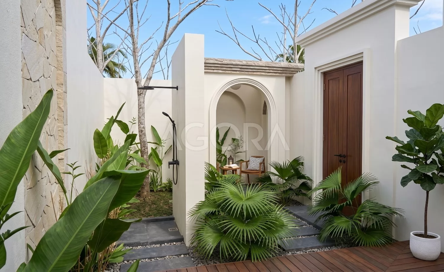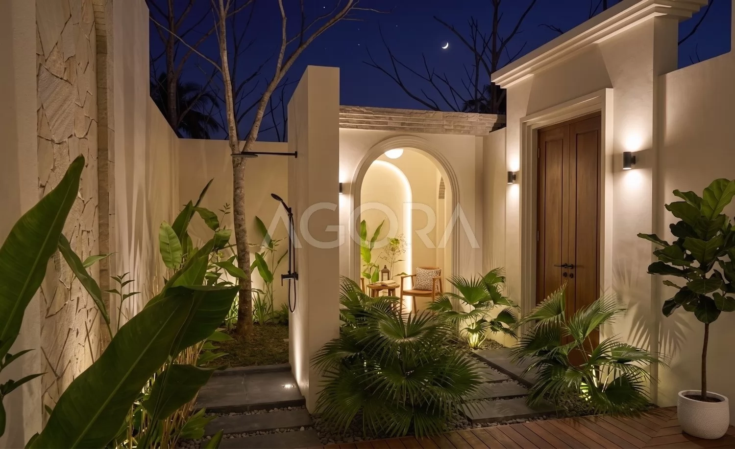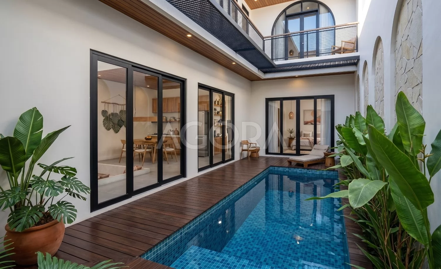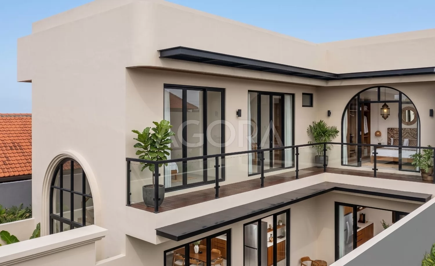 Desain villa modern tropis ini menghadirkan pengalaman tinggal layaknya private resort, dengan komposisi ruang yang terbuka, sejuk, dan penuh cahaya alami. Perpaduan elemen tropis, material natural, dan inner courtyard menciptakan hunian yang terasa intimate sekaligus mewah. Fasad rumah ini tampil modern dengan komposisi bentuk yang tegas namun tetap lembut lewat detail lengkung sebagai aksen utama. Dominasi warna terang, bukaan tinggi, dan sentuhan tropis membuat tampilannya elegan sekaligus terasa hangat.