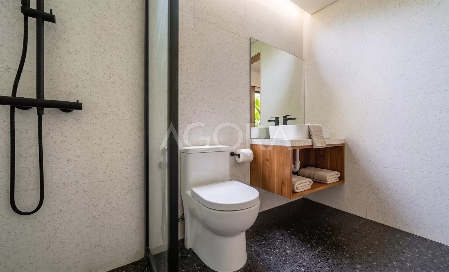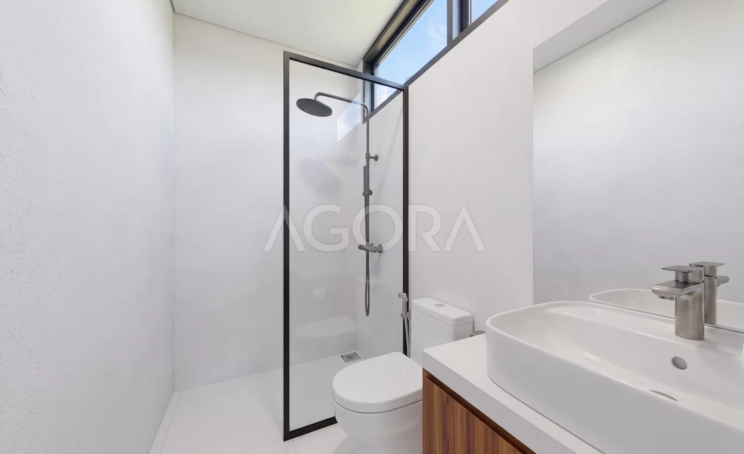 Bathroom tampil minimalis bersih dengan suasana yang menenangkan seperti ruang spa pribadi. Cahaya alami dari atas membuat ruang terasa segar, terang, dan memberi pengalaman mandi yang lebih rileks.