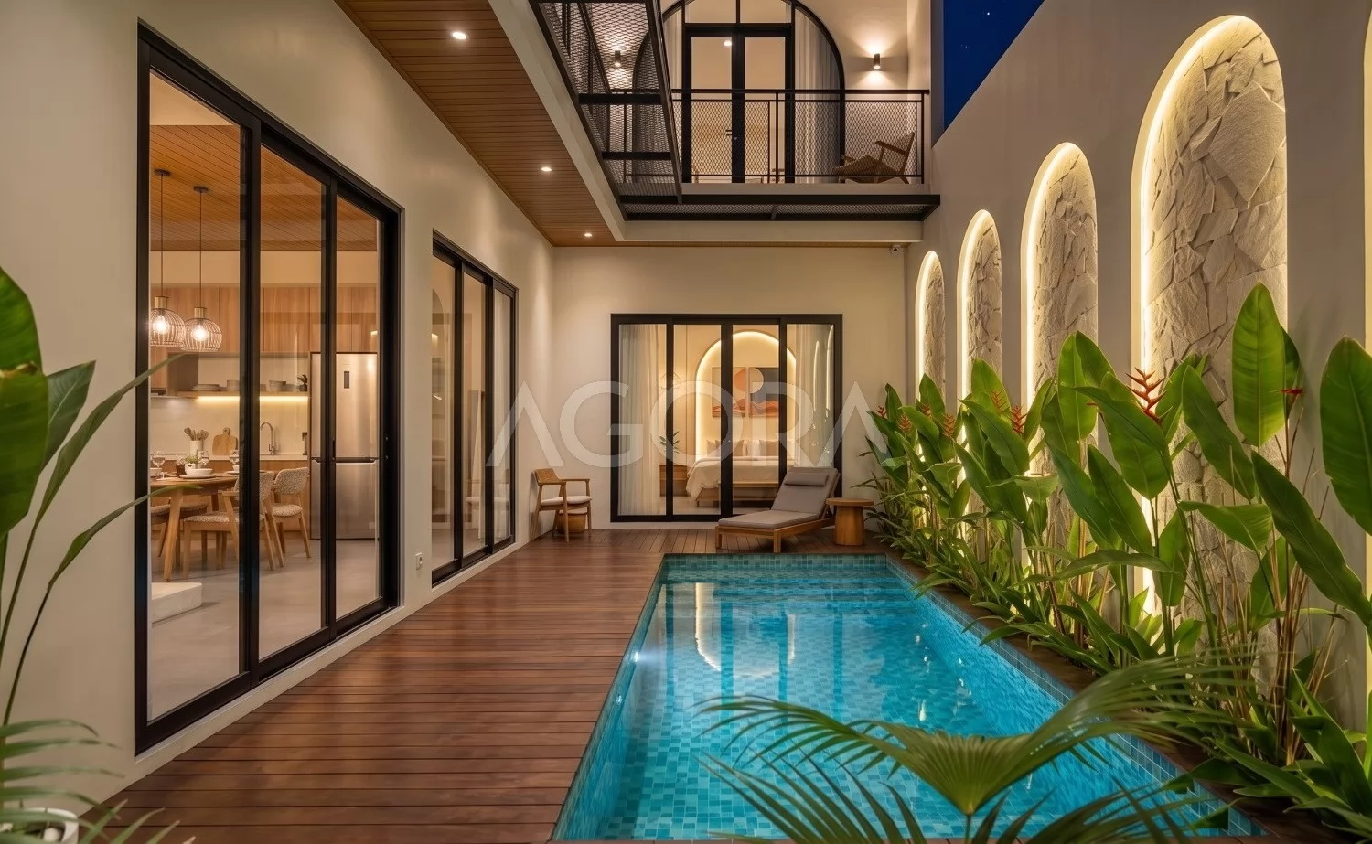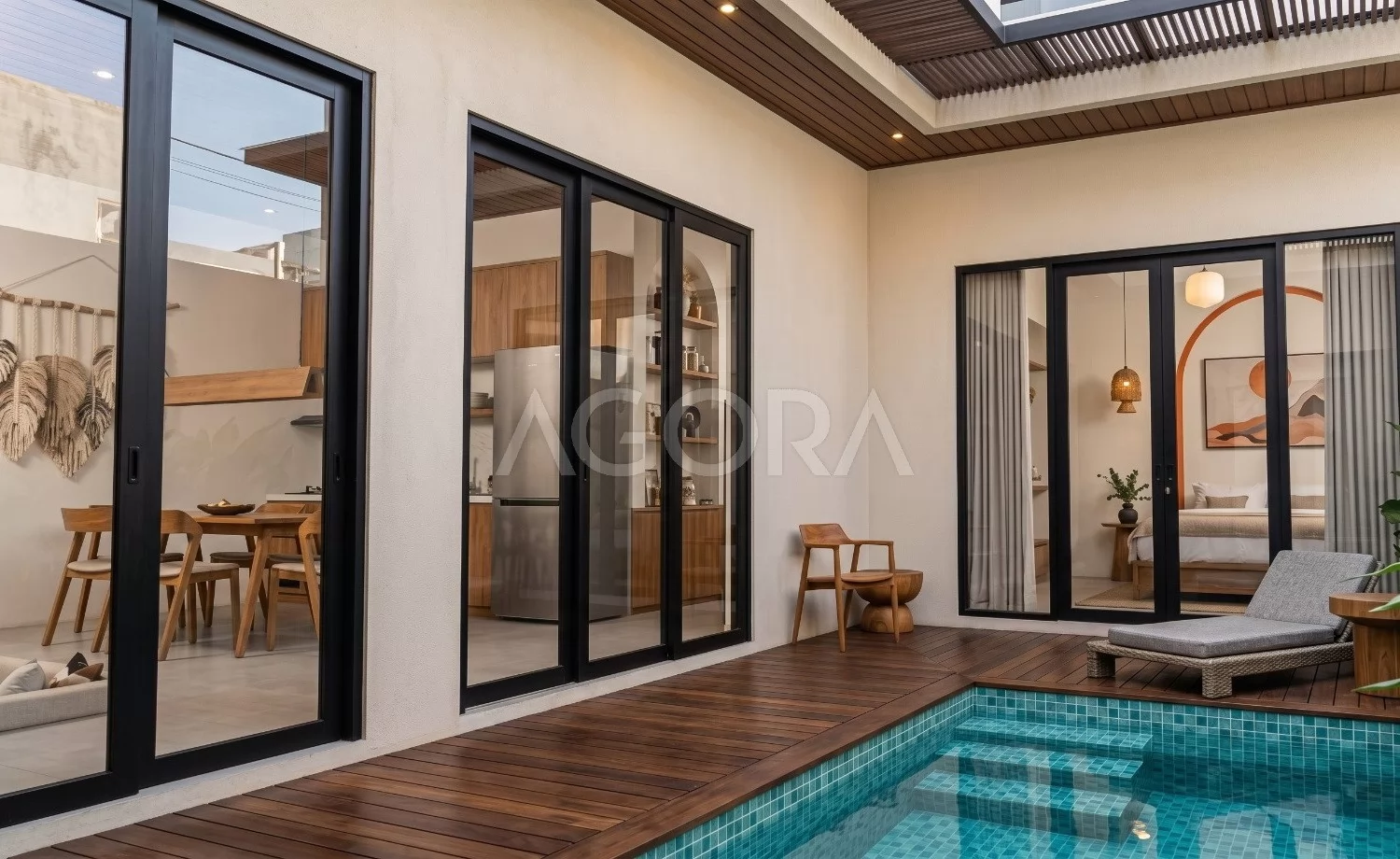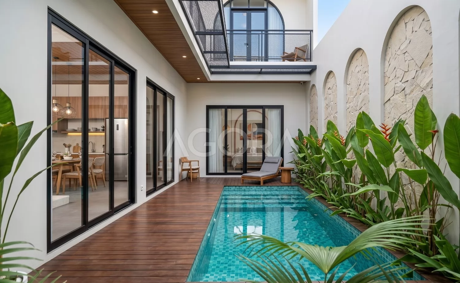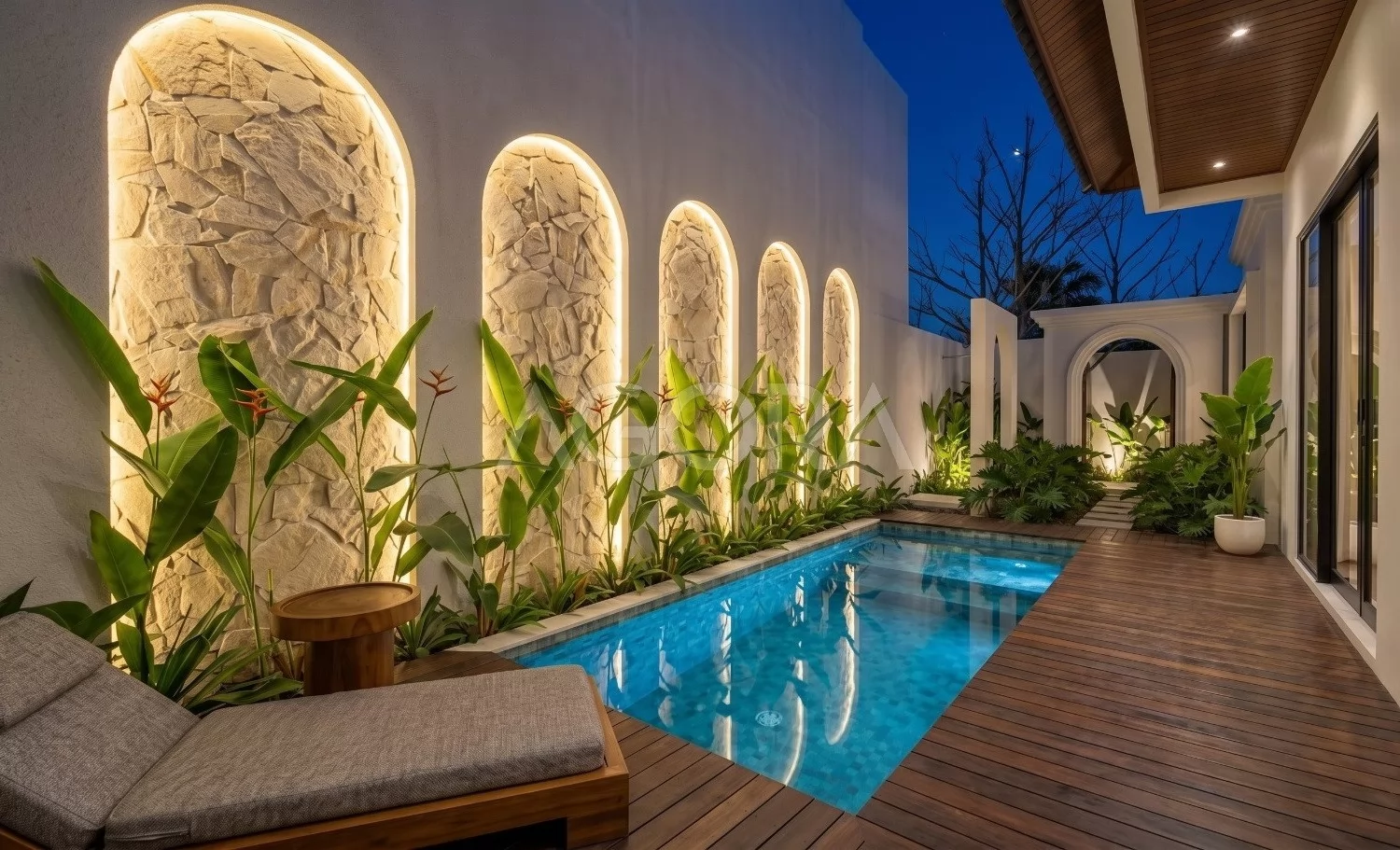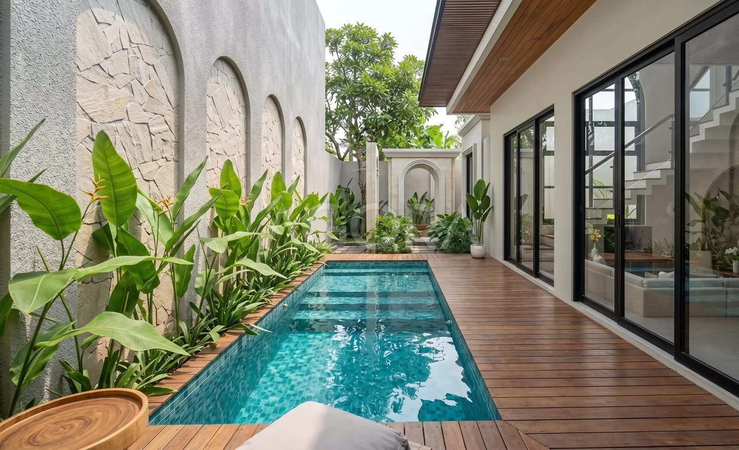 Kolam dibuat memanjang sebagai elemen utama yang mengikat area luar dan ruang dalam. Dipadukan deck kayu, tekstur dinding, dan tanaman tropis, area ini menghadirkan nuansa santai seperti villa resort.