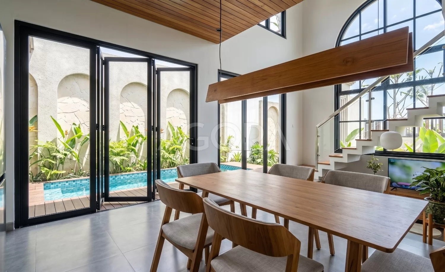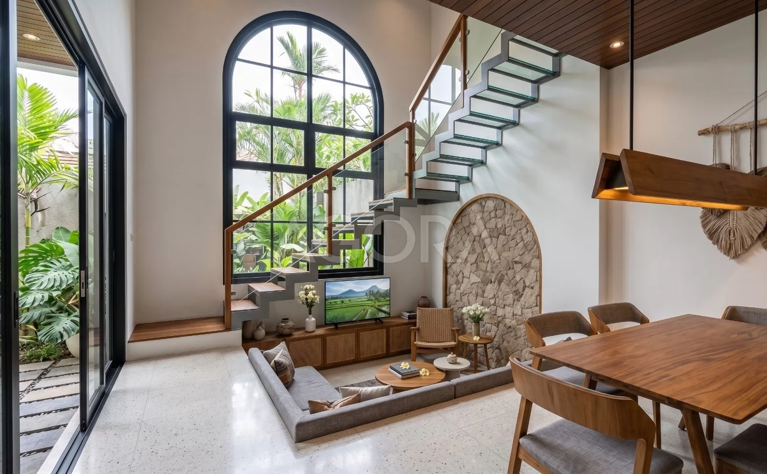 Ruang living dibuat dengan ceiling tinggi agar terasa lega dan memberi kesan dramatis sejak pertama masuk. Bukaan besar dan material natural membuat ruang ini terang, hangat, dan sangat terhubung dengan area outdoor.