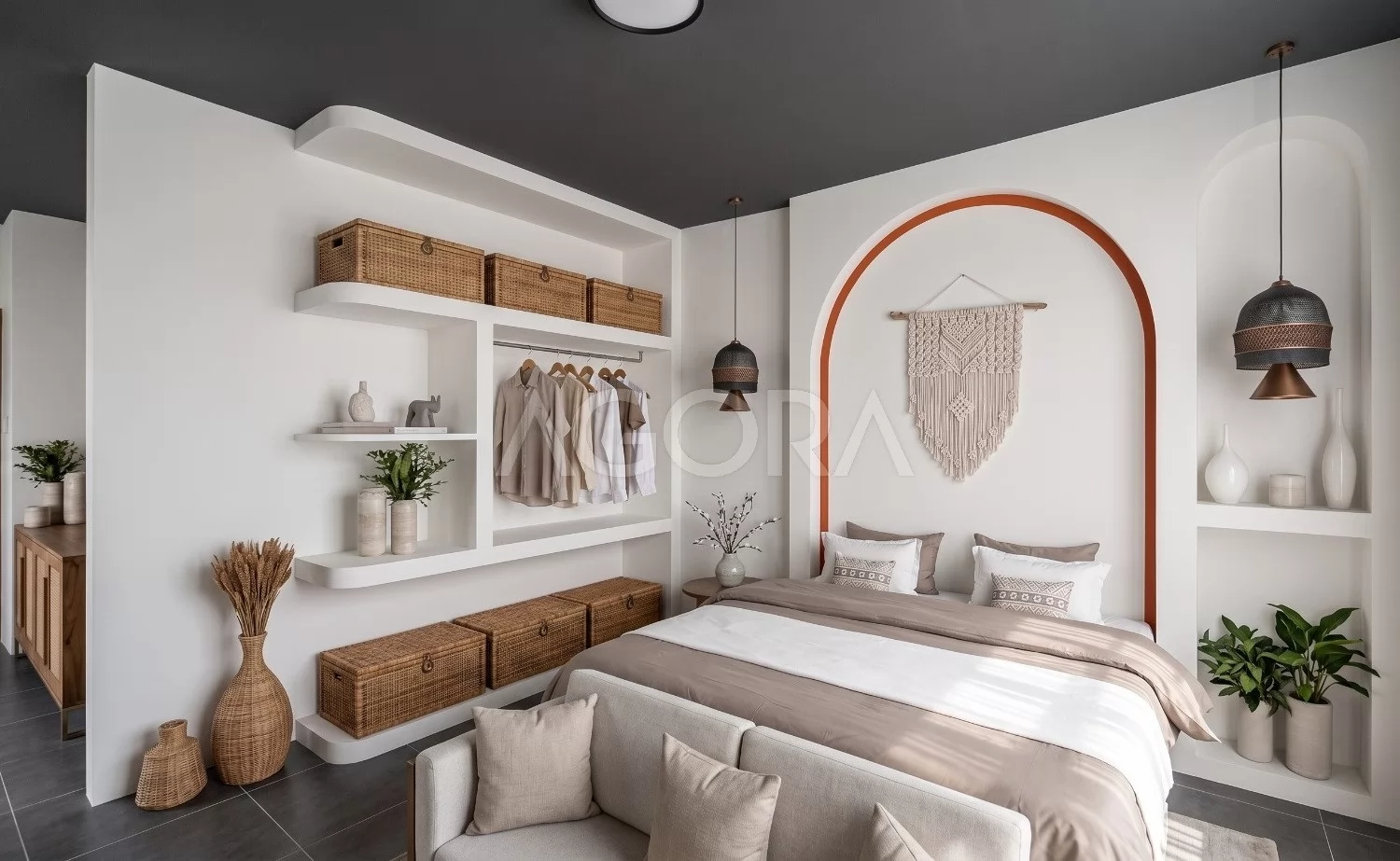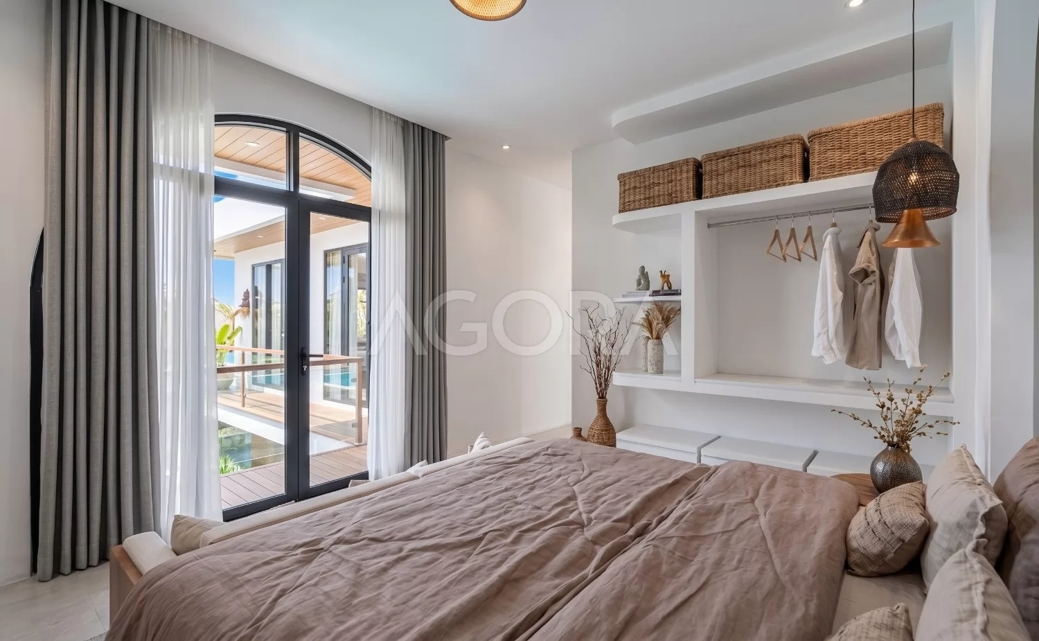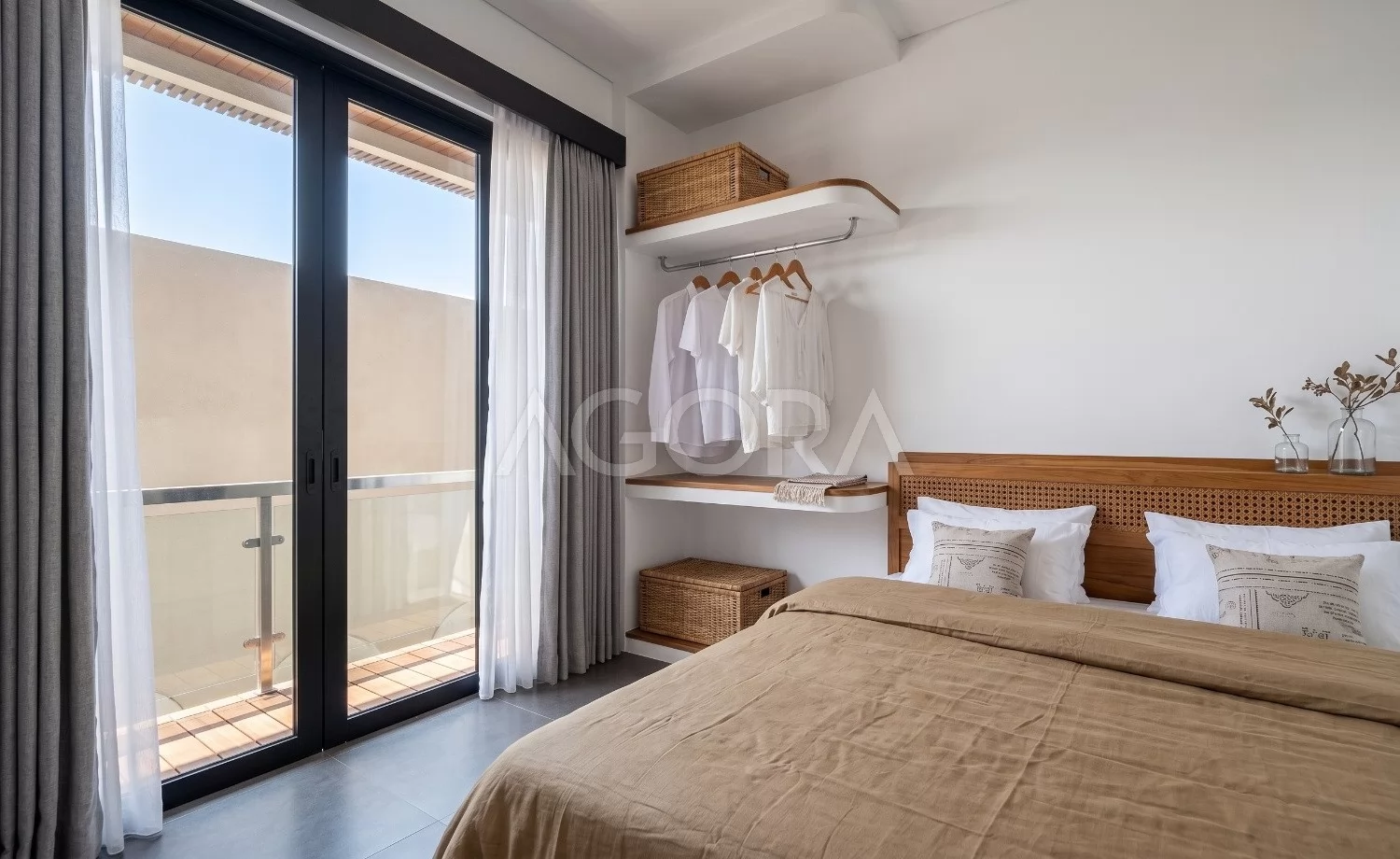 Kamar tidur didesain dengan pendekatan yang tenang dan nyaman lewat warna netral, material lembut, dan cahaya alami. Bukaan besar ke area luar membuat ruang terasa sejuk, airy, dan memberi kesan seperti retreat pribadi.