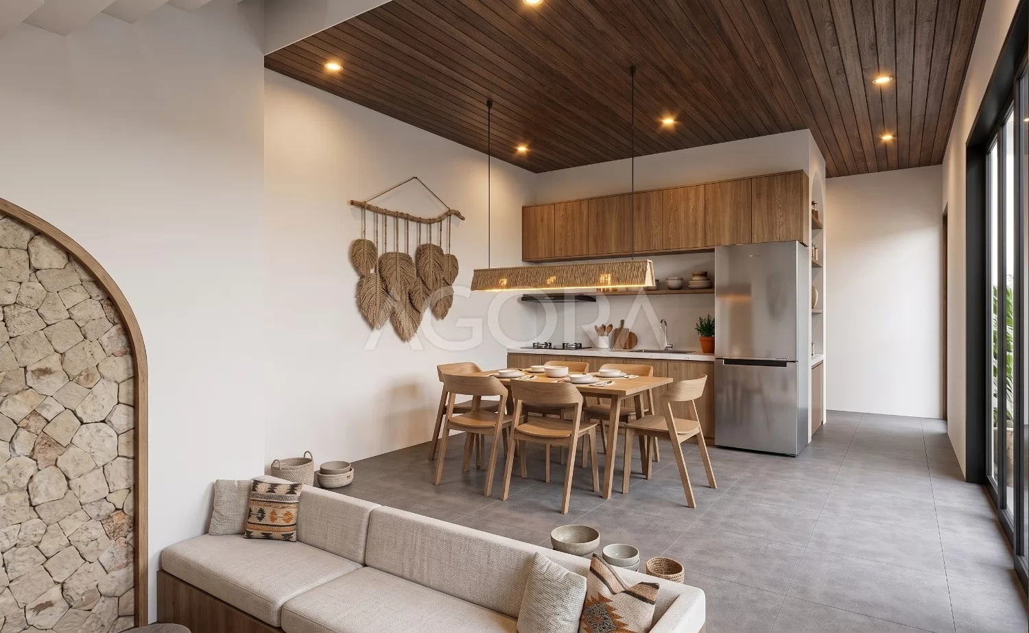 Kitchen mengusung konsep simpel dan fungsional dengan dominasi material kayu yang memberi kesan hangat. Tata letaknya menyatu dengan area komunal sehingga terasa terbuka, nyaman, dan hidup.