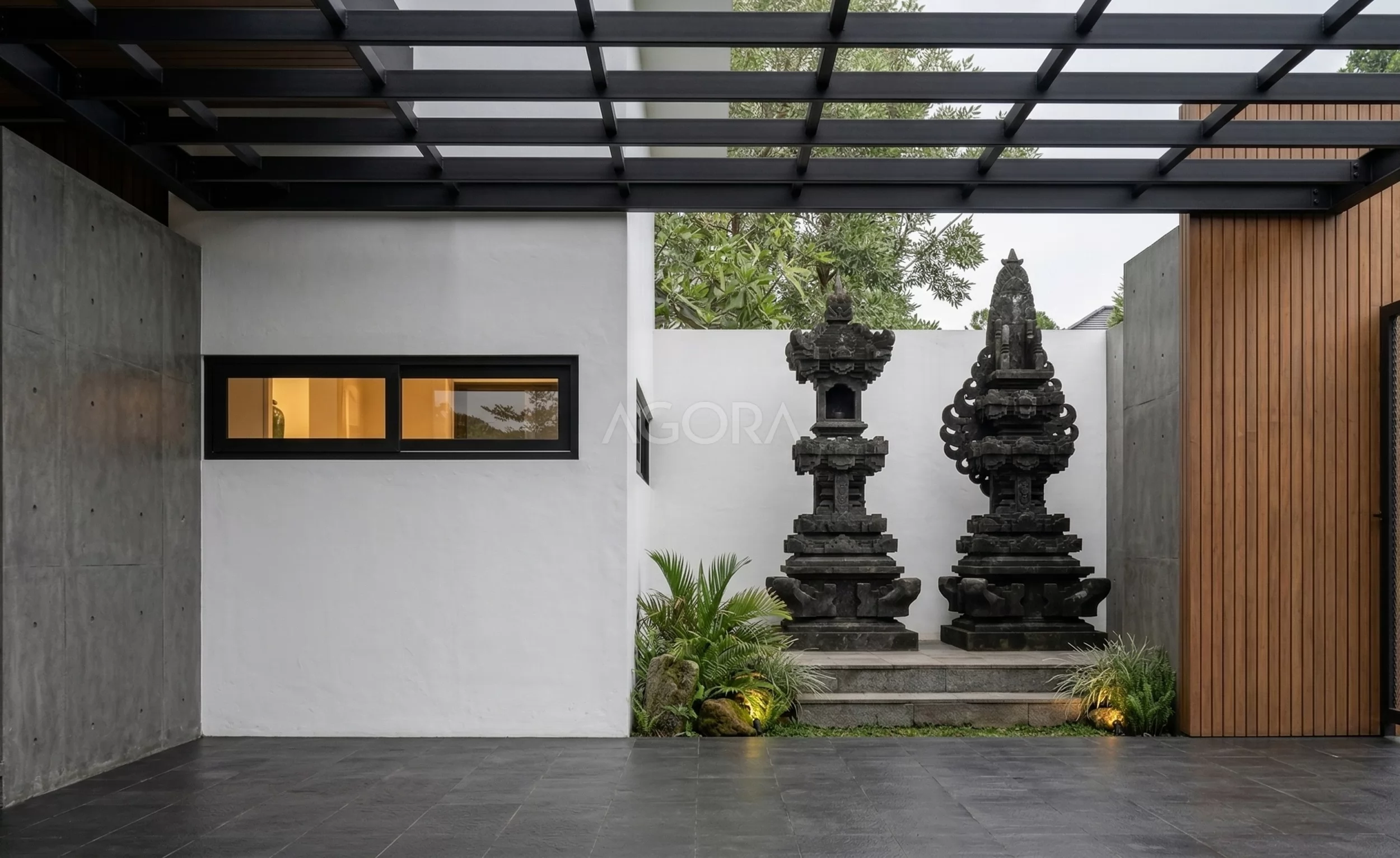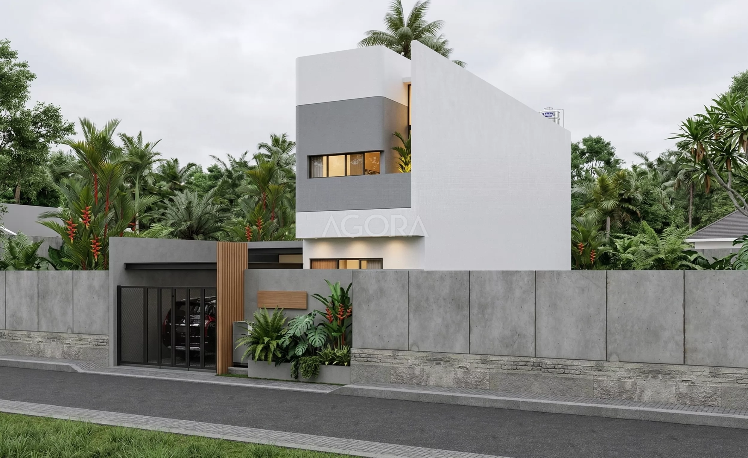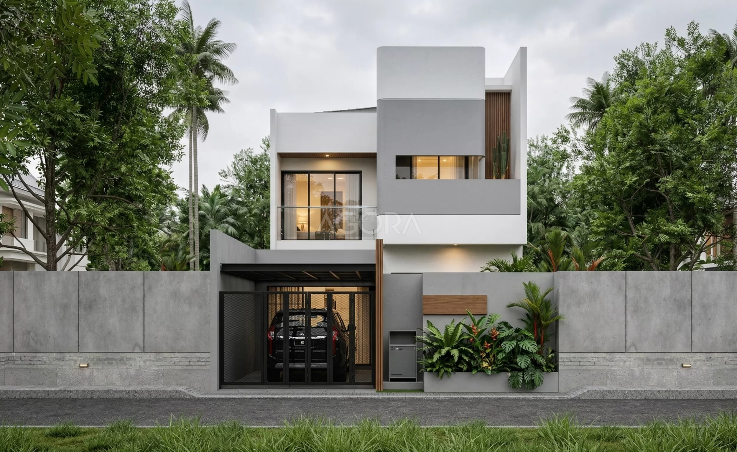 Bangunan ini merupakan sebuah hunian yang menghadirkan konsep Industrial Minimalist yang tegas namun tetap hangat dan nyaman. Komposisi massa bangunan dibuat tegaas dengan permainan bentuk geometris sederhana, menciptakan tampilan yang bersih namun tetap dinamis. Dominasi warna netral seperti putih dan abu-abu diperkaya dengan aksen material gelap, menghadirkan kesan elegan dan maskulin.