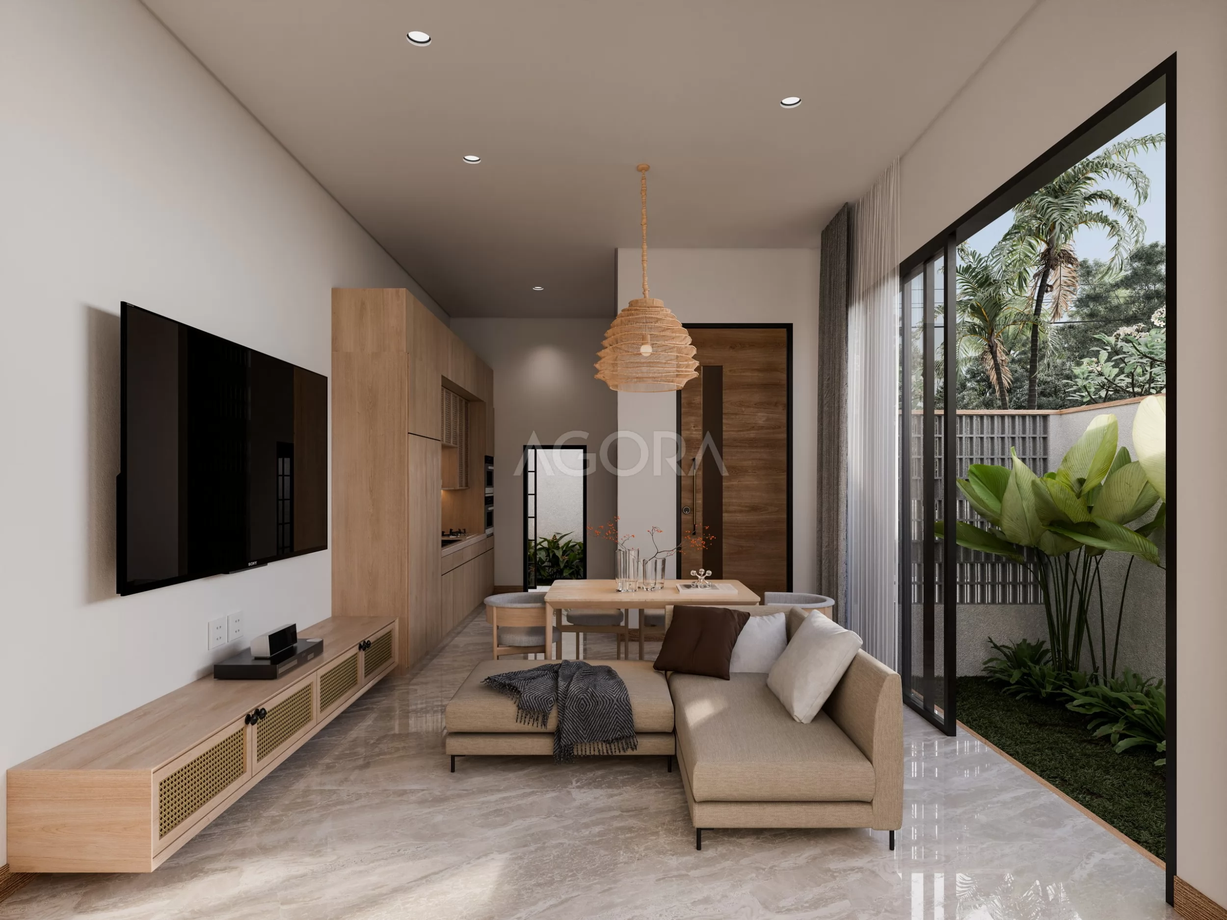 Bagian interiornya mengusung konsep Japandi tropis, memadukan kehangatan kayu alami dengan kesederhanaan bentuk ala Skandinavia dan ketenangan khas desain Jepang. Tata ruang dibuat terbuka, mengalir dari ruang tamu ke area makan dan dapur tanpa sekat masif, memberikan kesan lega meski pada lahan yang kompak. Warna-warna netral seperti krem, beige, dan cokelat muda mendominasi, menciptakan atmosfer yang tenang dan homey.